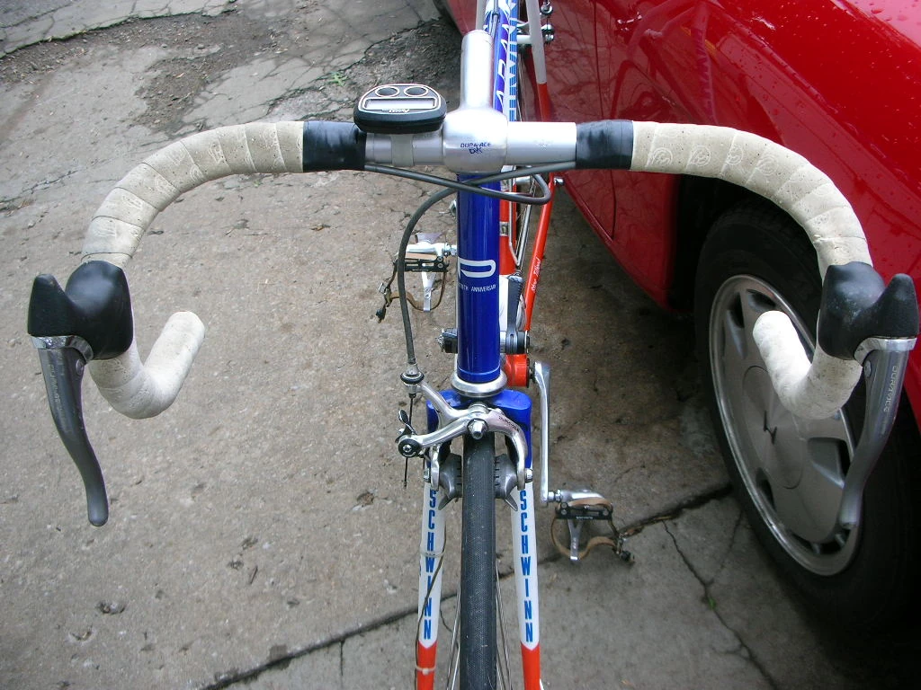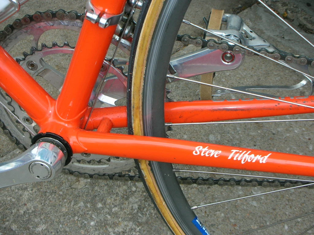 It’s kind of weird because a couple of years ago, someone contacted me with a link on eBay of an auction of a Wheaties/Schwinn Paramount of mine. I thought I knew where “my” frames were, but no. I ended up getting the bike back from the eBay guy after convincing him that I was “really Steve Tilford”. He was super cool. It was a pretty new Wheaties/Schwinn Team bike with my name painted on it. The serial number is my last name stamped in the bottom bracket shell. Good addition to my basement. Anyway, I’m not going to have a problem giving this guy a list of components from 20 years ago. I’m going to take a few photos of the bike in the basement. White Rolls seat, old Shimano SIS, Wolber tubulars, Avocet computer and all.
