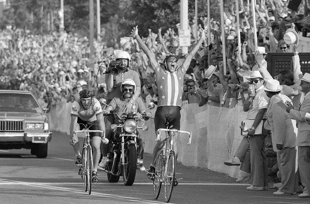 Winning the Olympic Road race in 1984 over Steve Bauer.