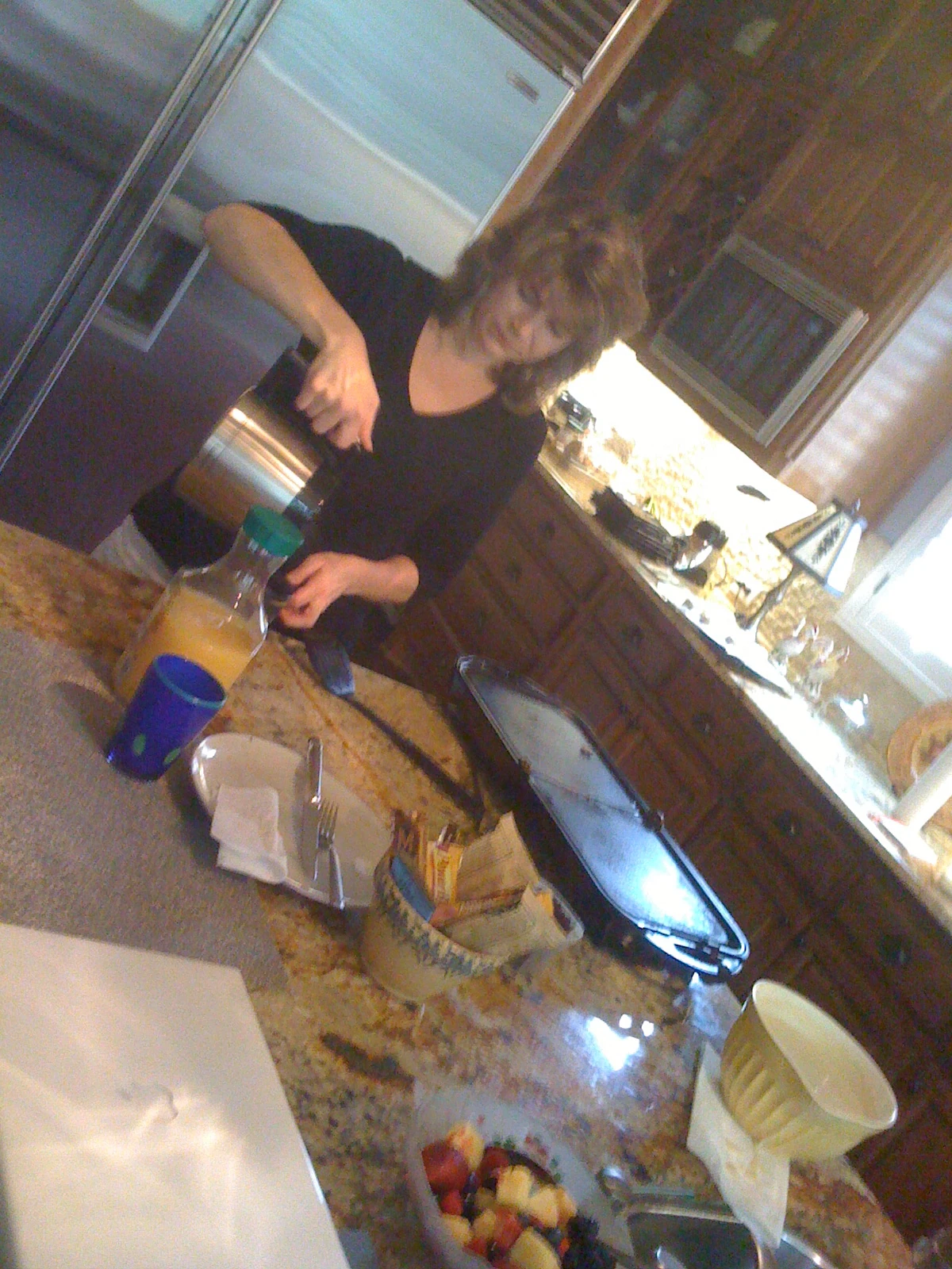 Charlene making us breakfast from 9 am to noon. Chocolate Chip pancakes, fresh fruit and great coffee. I was full from the night before.