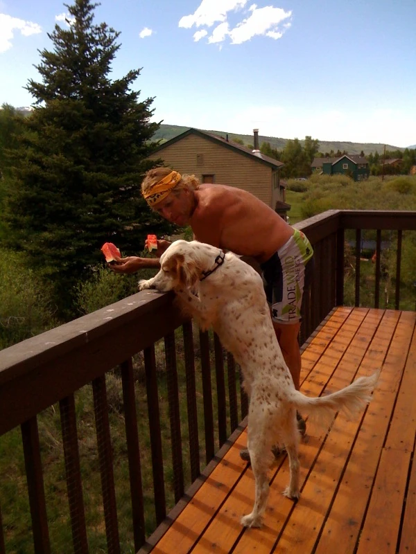 Eating watermelon on the porch with Bromont.