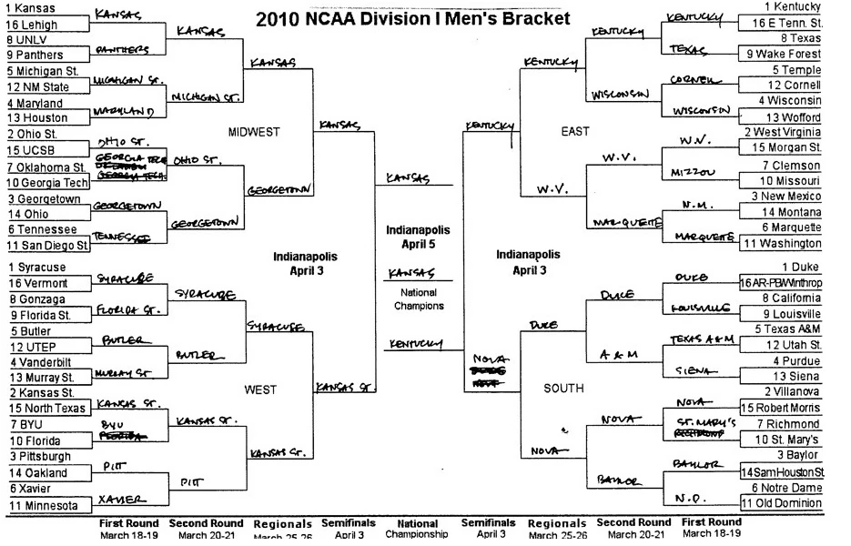 KU is ranked #1 going into the NCAA tournament. They were ranked #1 preseason and ended the season in the same position. They play tonight at 8:40. Don’t even think of bugging me from 8:40 to whenever. Below is Obama’s bracket. He picked North Carolina last year to win it all. Hopefully he’ll be 2 for 2 at the end of the tournament.