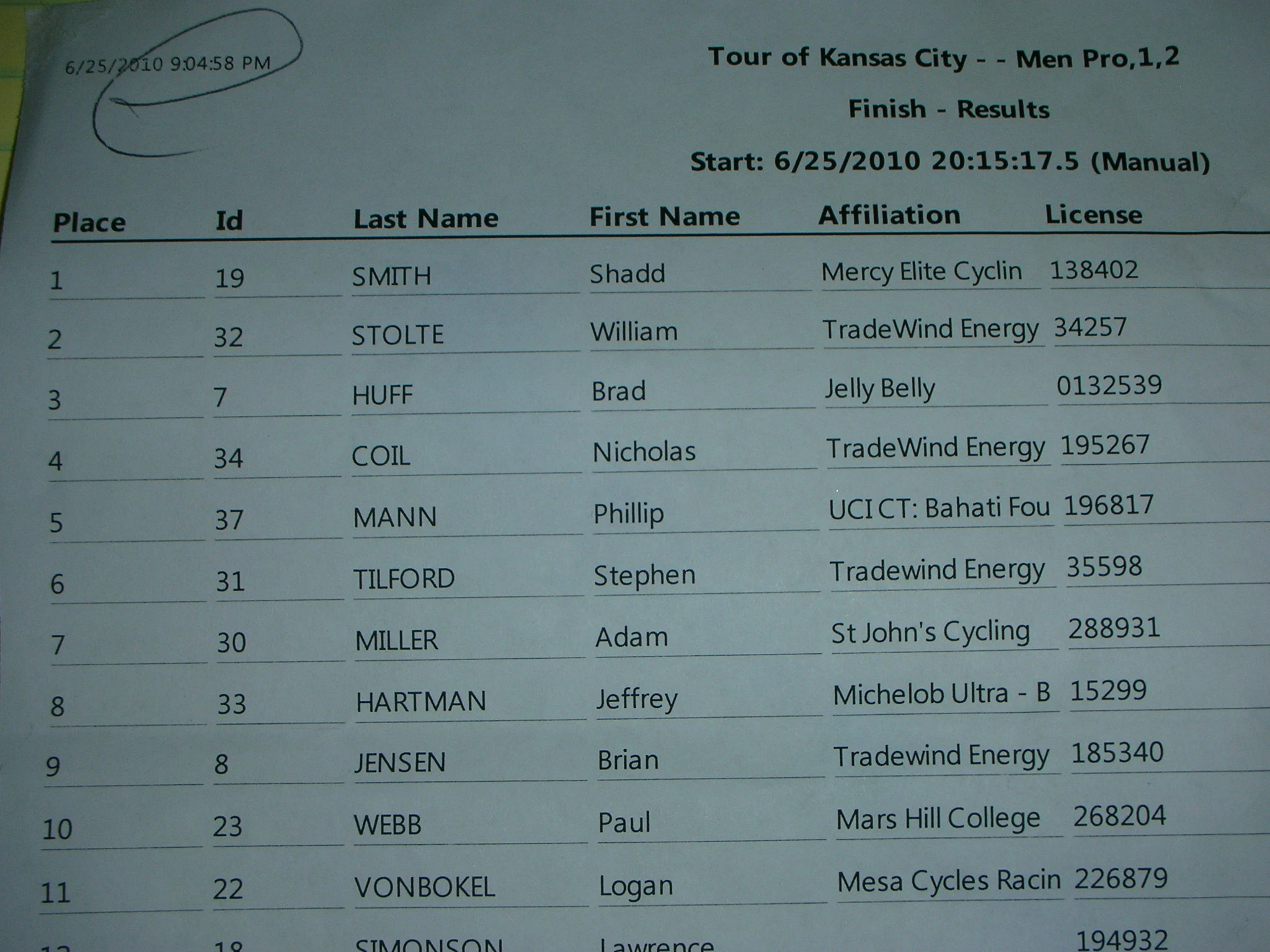 Things went just okay. Bill got away with Shad Smith, Mercy, early on and stayed away all 45 minutes. The race could only be that long because of darkness. Shad won which was good for him since he is from KC. Brad Huff rode me off his wheel in the sprint to finish 3rd. Nick Coil, Tradewind was 4th. All 4 our us finished in the top ten, so it is good for the overall.