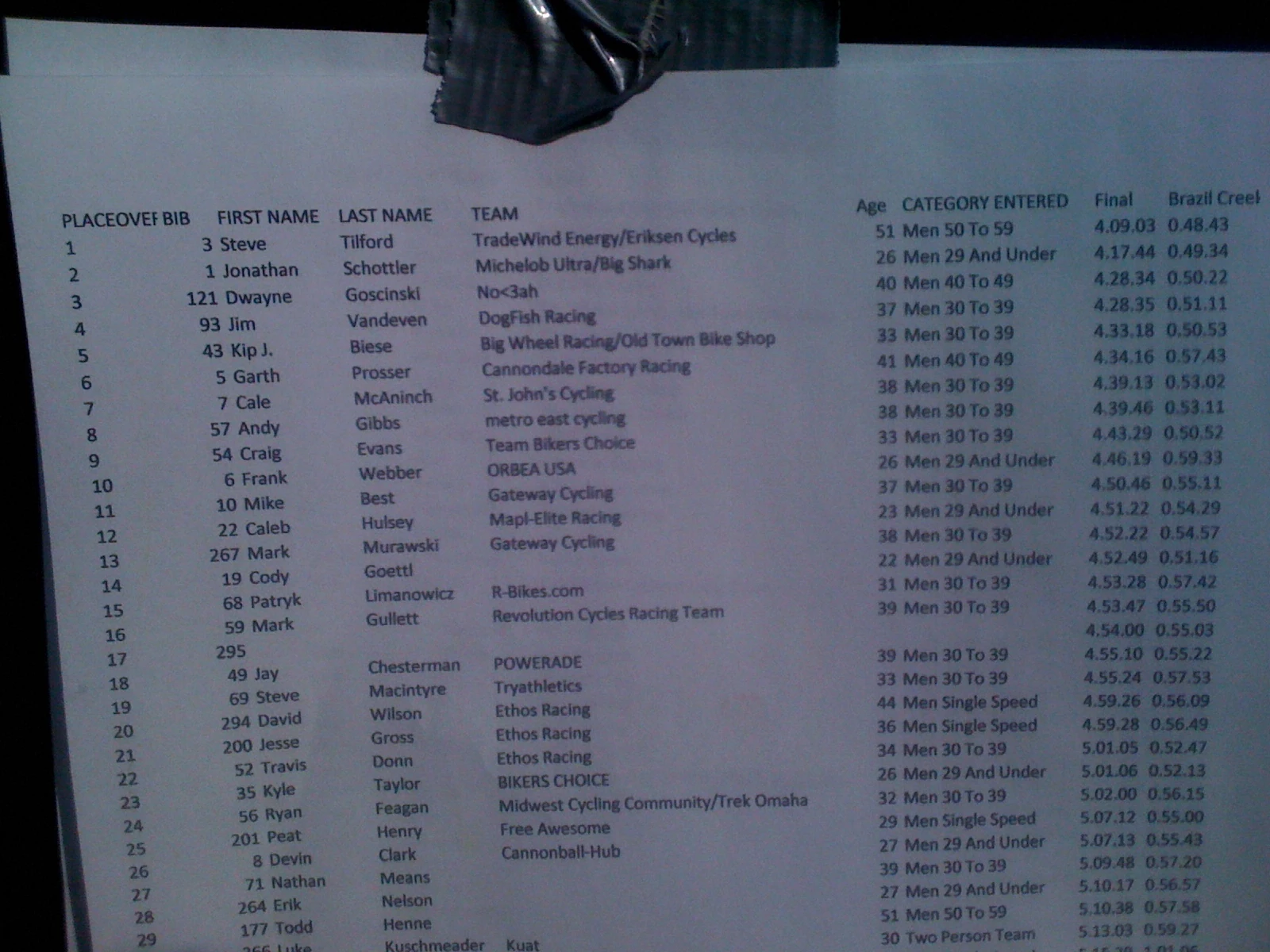 I led from start to finish. I didn’t have a perfect race. I crashed once when I caught the tip of my bars on a tree, while descending pretty fast. I burped my rear tire and had to put air in it. Plus, I almost got lost once when I came to a leaf covered double track that wasn’t marked. Bill rode off course there and it led to a mile descent to nowhere that he had to climb back up.