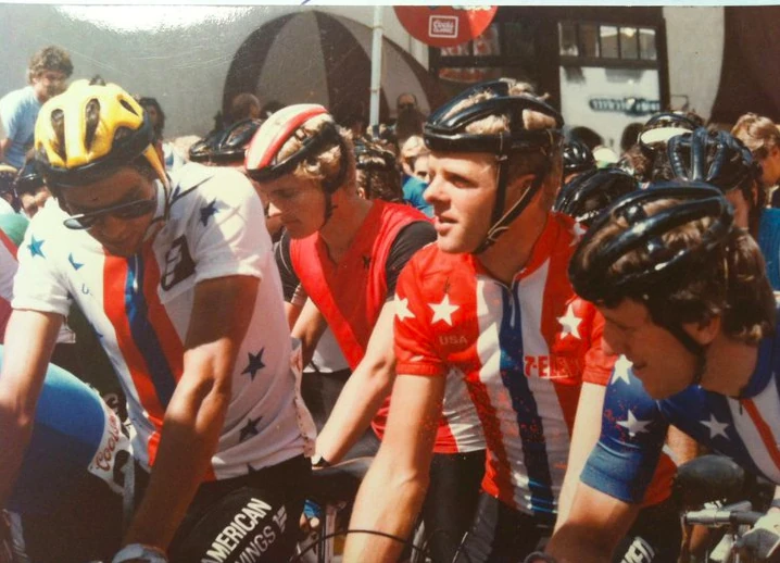 Here’s a photo from the 1984 Coors Classic in Colorado. We had to ride for National Teams, so they bent the rules by having 3 National Teams, red, white and blue. This is Alexi, Ron Kiefel and myself.