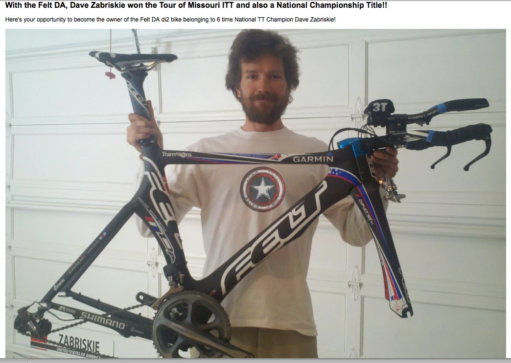 Here on eBay, you can get Dave Zabriskie’s old TT bike for a modest $5500. Of course, you’re going to have to drop another $3000 on fast wheels.