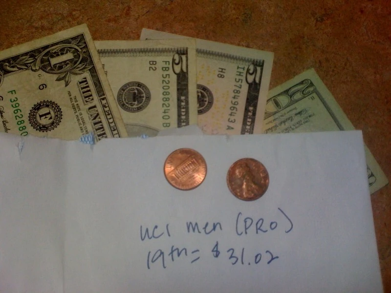 Prize money for 19th. If I add the $14 I picked up during the race, I made total 2 cents more than $45 entry. Can you believe they actually put the 2 pennies in the envelope?