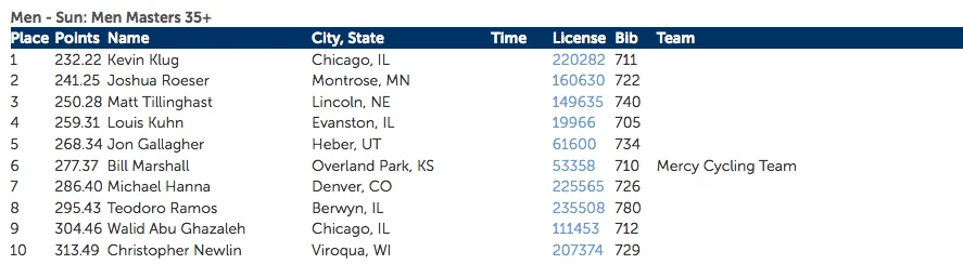 I am two spots behind you steve. Here are some standouts. It doesnt matter as they have uci points but it shows bad math. 49 218.26 Jonathan Page Northfield, NH 102 239.52 Brian Matter Sheboygan, WI 122 247.50 Mitchell Kersting Louisville 134 252.70 Molly Cameron Portland, O