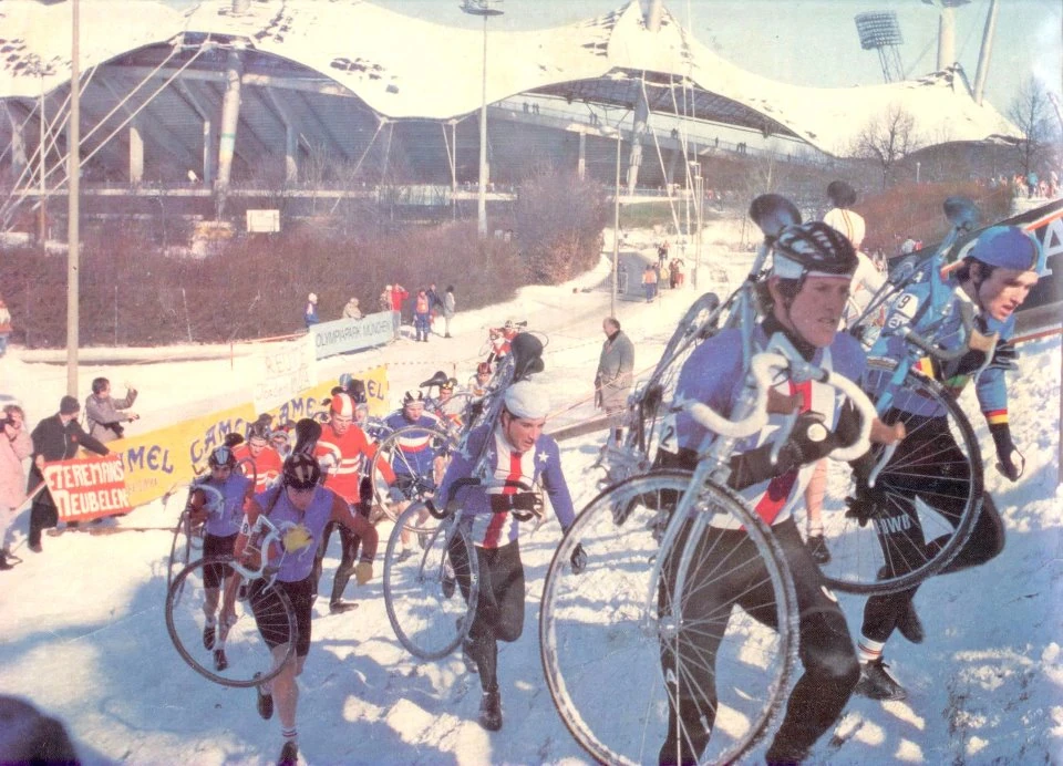 This post really brings back memories of my late-80’s attempts at cyclocross. WTB toe-flips, coins under the pedals (for balance), and Mafac cantilevers. I modified soccer shoes by removing the front spikes and mounting pedal cleats to the soles. The only tire back then was the Specialized Tri-Cross (I still have one somewhere) and I raced on a Schwinn touring bike because I couldn’t afford a real, european cyclocross frame. Cool race pic at the Munich Olympia Stadium. I visited there in 84 & 85.