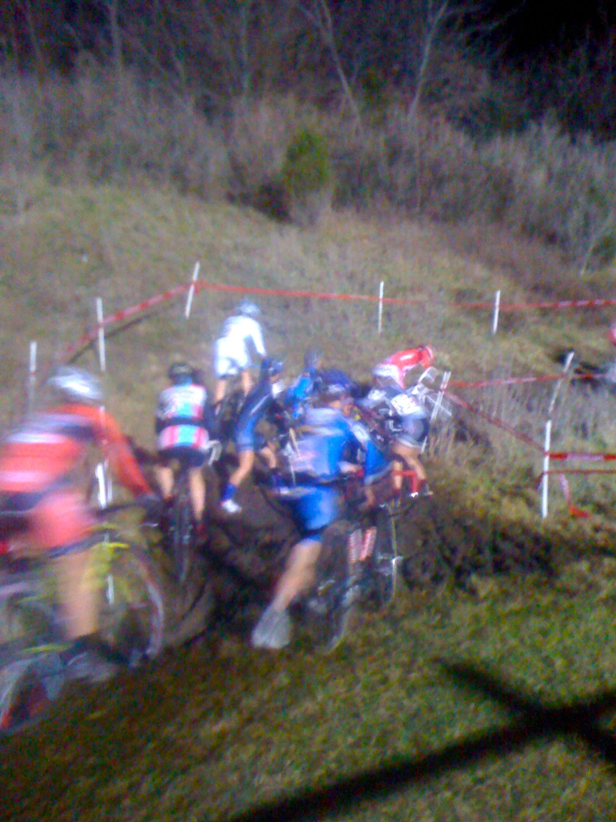 I got a super good call-up. I think maybe 13th, but definitely in the top 15. I was on the 2nd row. This is the first time that the “random” call-up has worked for me. I got an okay start. I didn’t feel like I needed to push it because I didn’t need to finish in the top ten, like it would be easy. So, I was somewhere between 10th and 15, but everyone was in line connected. The first time we went through the muddy ditch, Chris Jones screwed up big time and hit a rut that shot him off course into the ribbon. That was the start of a huge log jam. I dismounted and ran, but didn’t move up. Then on the fly over, I passed a couple more guys and then on the hill a couple more. 1/2 a lap in I was in 10th and was thinking that was pretty good, but I needed to loose a place before the finish.