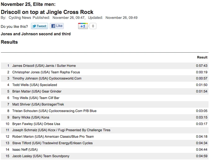 Jamie Driscoll and Tim Johnson were pretty far ahead, but Driscoll dropped Johnson and Chris Jones came back from the dead and caught Tim and then passed him for 2nd. Todd Wells finished 4th. I think Brian Matter was 5th. I was 13th and didn’t have to ride very hard the last couple laps to get that place. I must of been close to 5 minutes back, but haven’t seen the results. I am still pretty waxed. My main problem this morning is that I woke up after sleeping about 3 hours and my left knee was super painful. I had hope it would loosen up walking, but that doesn’t seem to be the case yet. I’m going to go on the internet and see what the problem is. It is the outside, in the little crack, where the knee pivots. Plus, my tooth is crazy painful. I’m eating antibiotics like candy though, so I hope that will turn around very soon. Brian Matter has a bad tooth problem too. His is so bad that you can actually see a lump in his cheek. I told him he doesn’t want to be messing around with that and needs to take care of it ASAP. He says it doesn’t hurt, but I don’t think that matters so much.