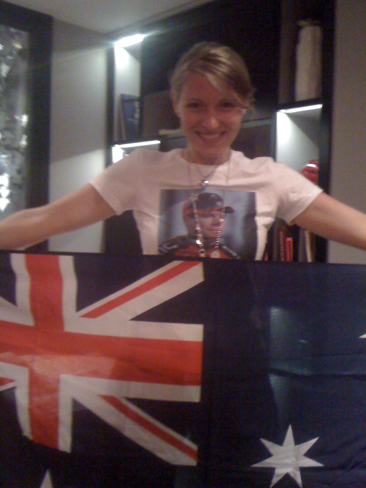 This is Cadel’s wife, Chiara, flying the colors after the TT victory by Cadel. She was pretty emotionally exhausted from the whole thing.