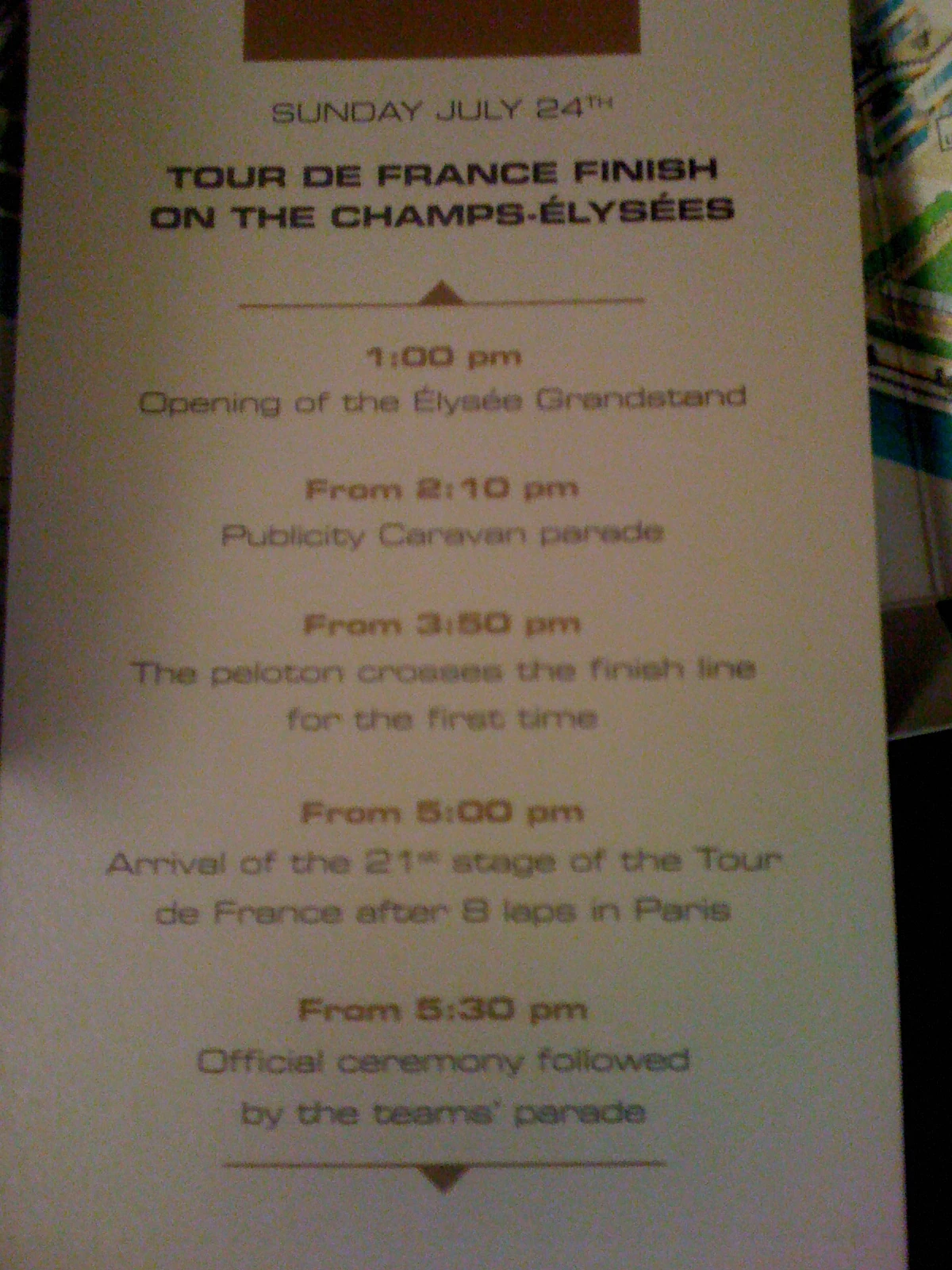 So now, from my perspective, it is going to be a Cadel Evans celebration. It started as soon as Andy Schleck crossed the line. At least here in Paris, champagne was flowing. I am pretty mixed up on time, but am up for whatever. We just got back from a long and enjoyable dinner and it’s nearly midnight, but I’m going to go out and walk for a while. Trudi isn’t showing for a couple hours. She has to drive from Grenoble to Paris tonight.