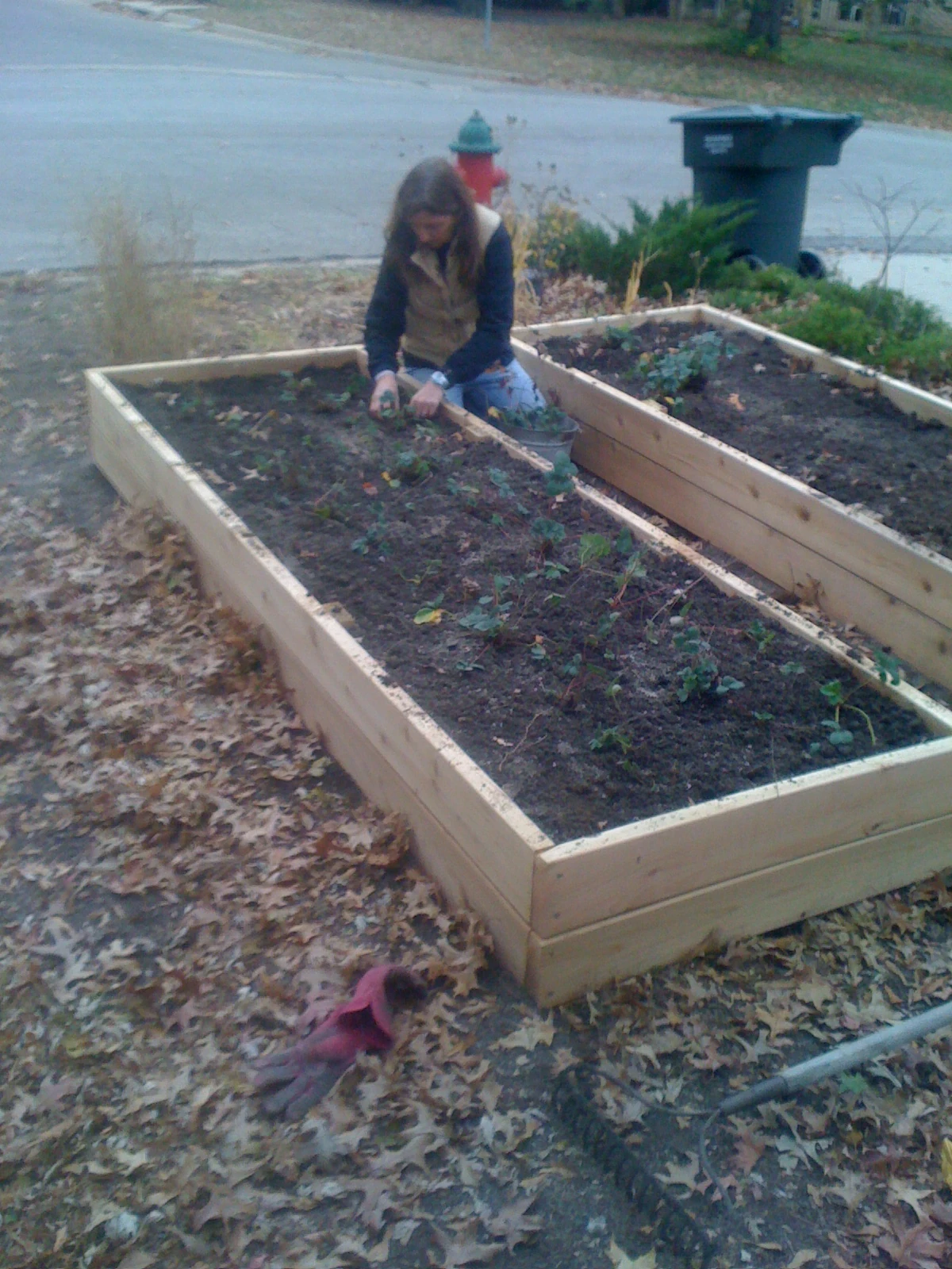 Trudi moving all the strawberries into the new planters in front.
