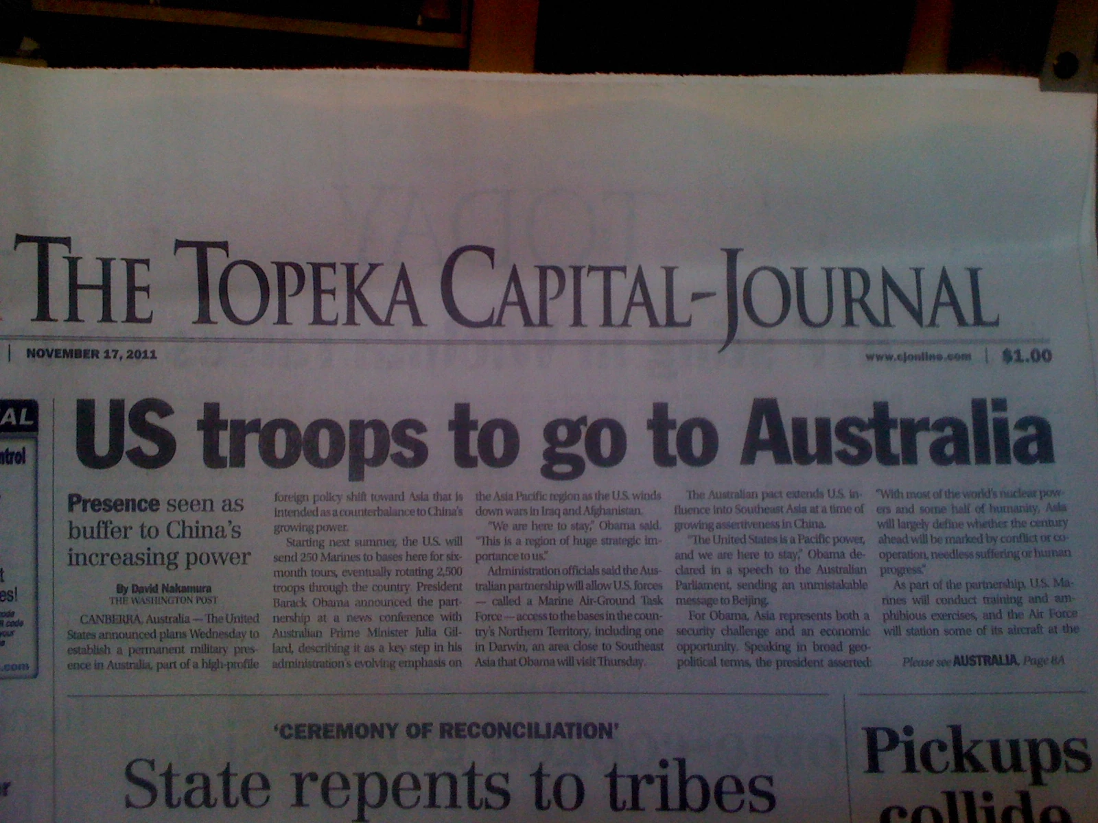 The main headline of the Topeka paper yesterday was that the United States was sending troops to Australia to counterbalance the growing power of China in the region. The article says that “we” are sending 250 trooper to “buffer China’s increasing power” . Okay, this is bullshit. I just looked it up and China has around 4,500,000 troops in its’ armed forces. About 1,500,000 more than the United States. And lots more people that aren’t in their army, but could be. I don’t think the 250 marines we send to Australia is doing anything other than make the 250 US Marines that get stationed there extremely happy. I don’t even think it can be construed as a statement. It is disappointing.