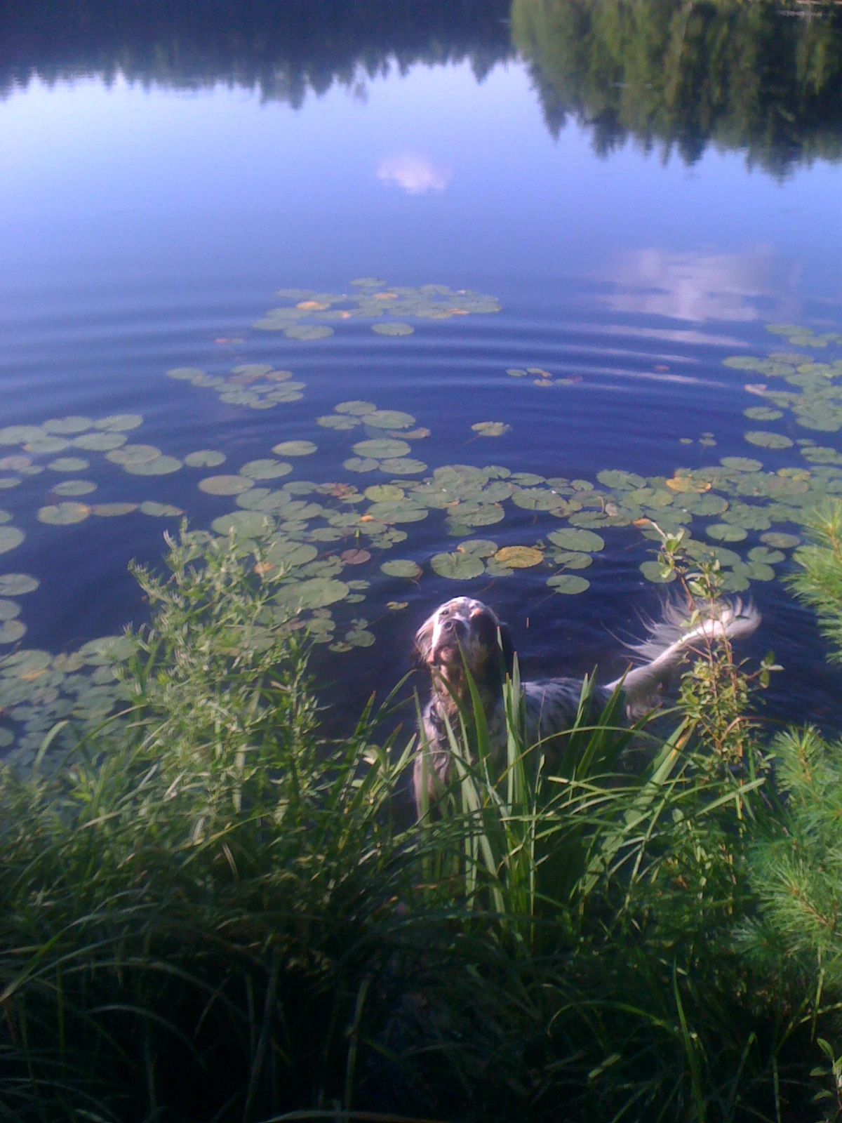 Here’s Hawkeye who swam with me. Bromont just ran by like a bolt of lightening. He came back later wet, so he went for his own swim.