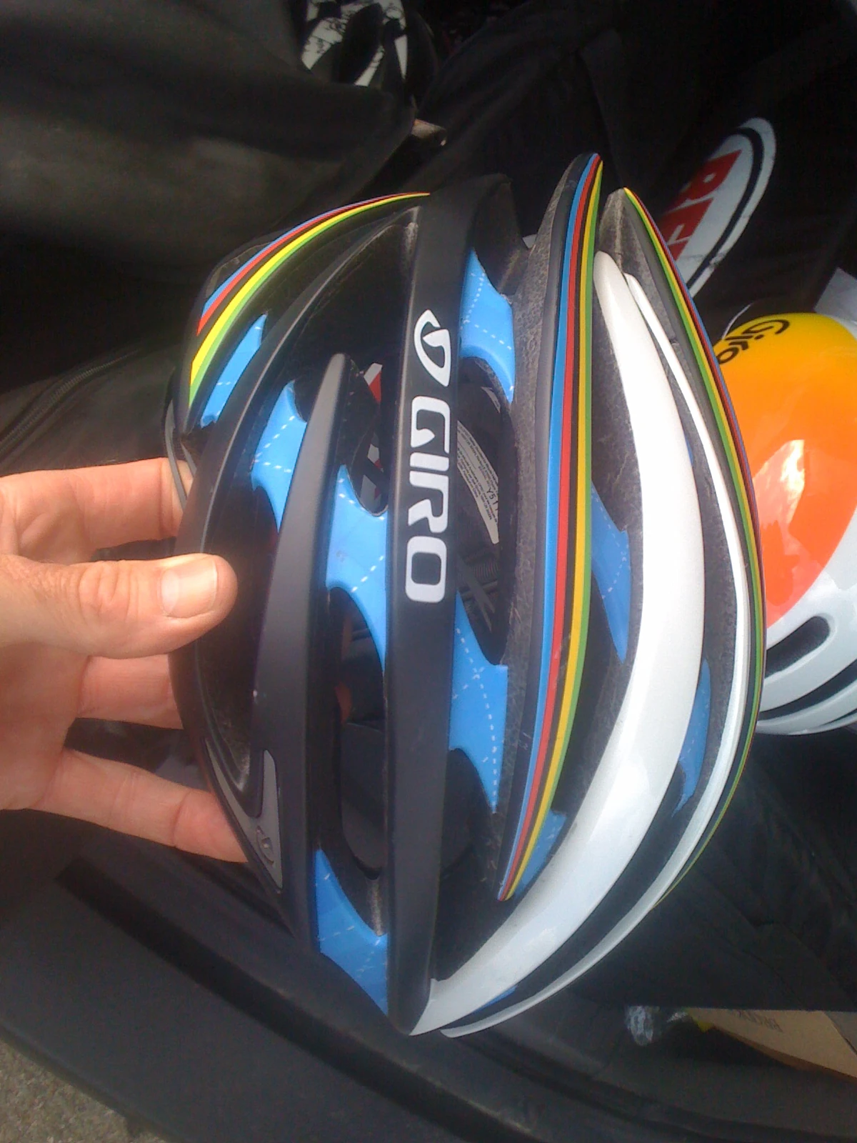 I was over at the local bikeshop, Capps, and ran into the Giro/Easton/Bell Sports, rep, Trevor Litten. He was showing me the new Giro helmets. Crazy light. But, did I end up with this new World’s helmet. No.