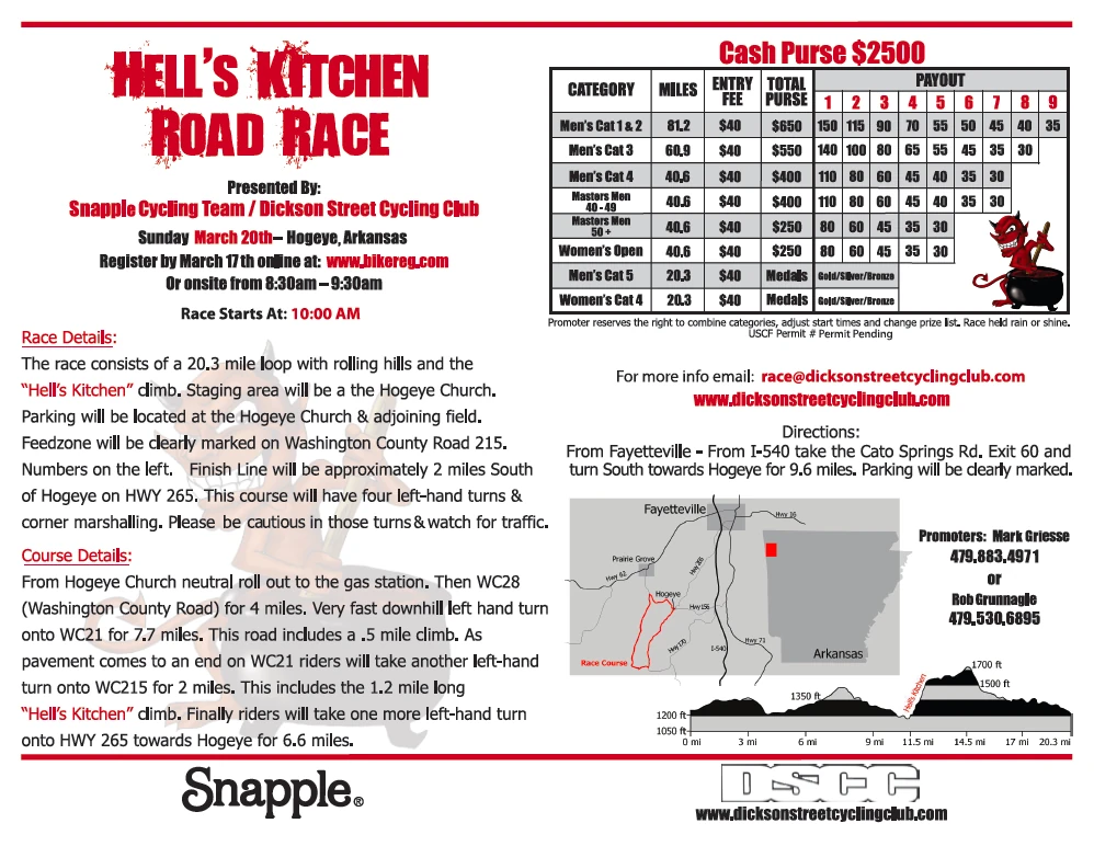 The Hell’s Kitchen Road Race is this Sunday outside Fayetteville Arkansas. Here’s a link to online registration at Bikereg.com. If you’re looking for somewhere fun to go ride a bike, this is it. The course is great with one long, steep climb and a few other rollers. The is in the same area as the Hogeye Road Race from Joe Martin NRC event. The weather is supposed to be in the 70’s on the weekend. I’ve won the race a couple times and they give out pitch forks to the winner’s. Nothing better than that!
