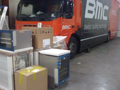 A pile of stuff going into the new BMC Team bus. Notice two of the items are wine coolers. My kind of bus.