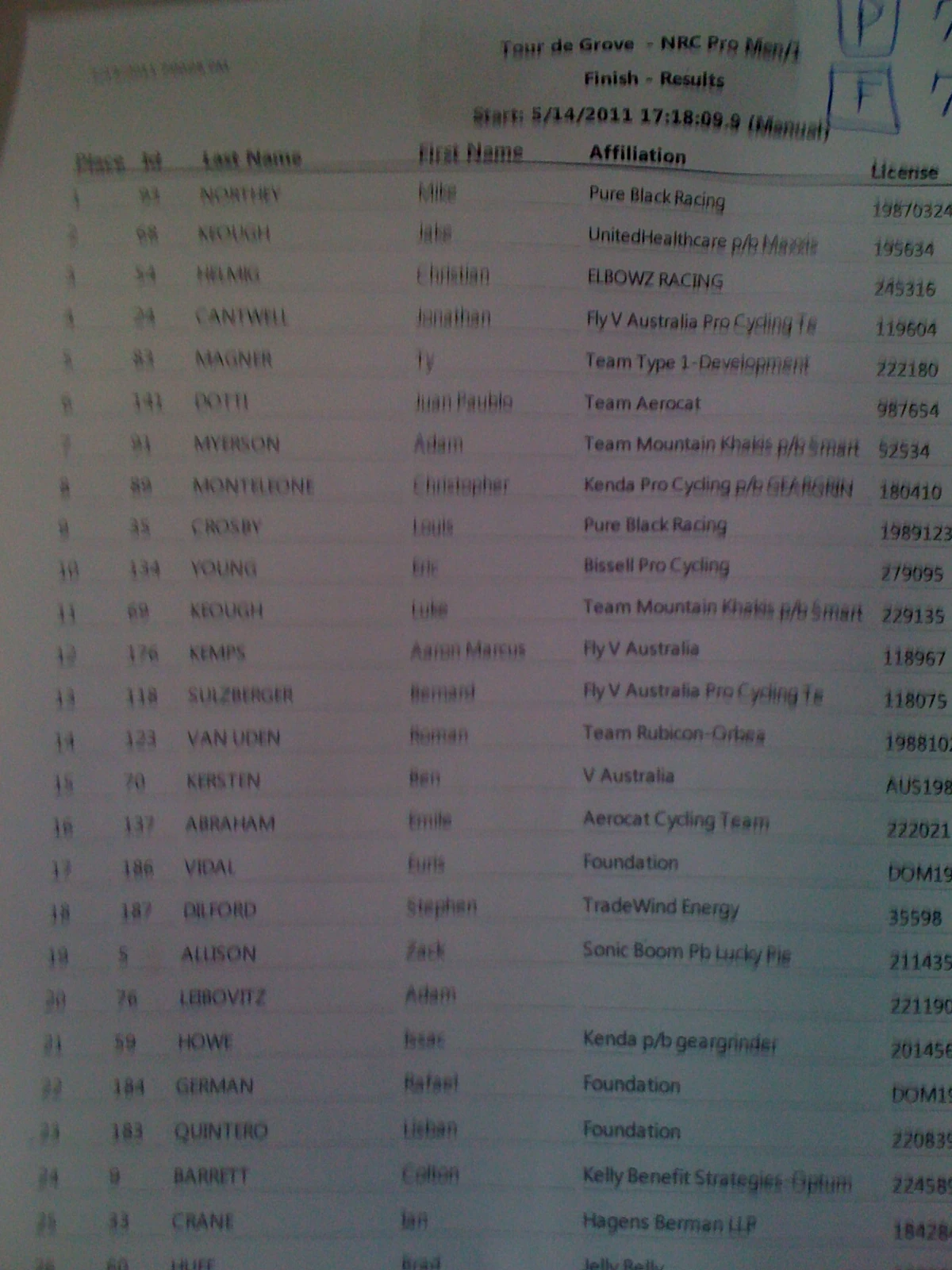 The Tour de Grove yesterday went pretty much exactly like I’d figured it would. I knew when I was driving to the race, in the rain, that I would be racing in the rain. It wasn’t exactly raining the whole time, but it was wet. Wet enough that the field was timid. Beyond timid. Which was fine for me. The course was long, maybe 2.5 km. Pretty much a L, with a squiggle in the middle. The only corner that was dangerous at all the the final 2. The final 2 corners were really just one. Kind of a U-turn. That doesn’t mean that there weren’t guys falling all over the course.