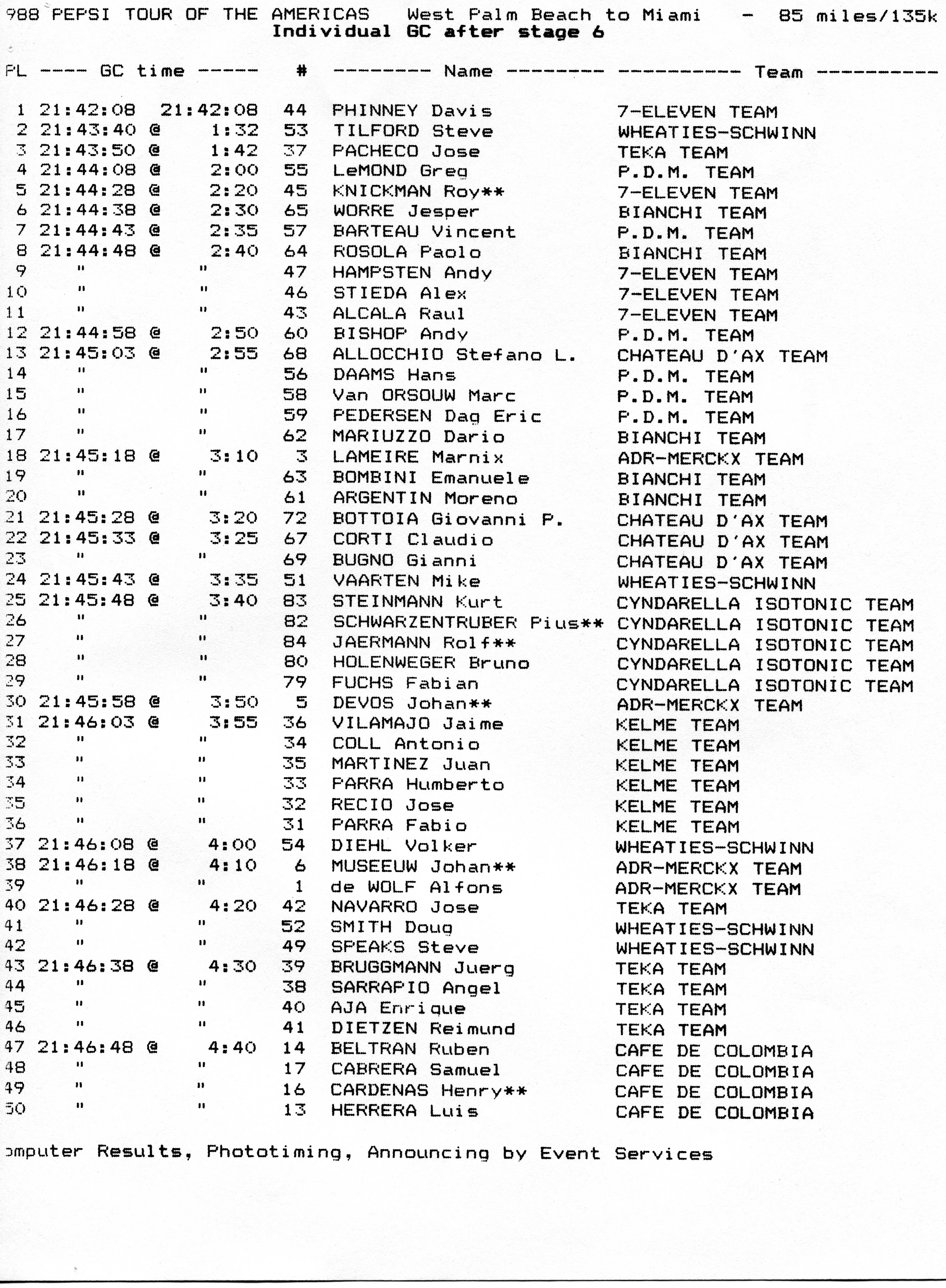A few days later I was on the beach, thinking over the race and I got back to the time bonus sprint and Vincent wigging out when he got beat. It didn’t make sense. So, I went back and looked at the results and there it was. If Vincent would have won the mid race sprint there and got the 5 second bonus, he would have moved up and tied Worre on time. And beat him on GC since he had better stage finishes. If he would have been 6th, moving Worre back to 7th, then that would have been more than the 50 point difference to make LeMond win the Overall series. It was nuts. No one saw it. Bianchi never paid attention to it during the race. The journalists never wrote a word about it. Nothing.