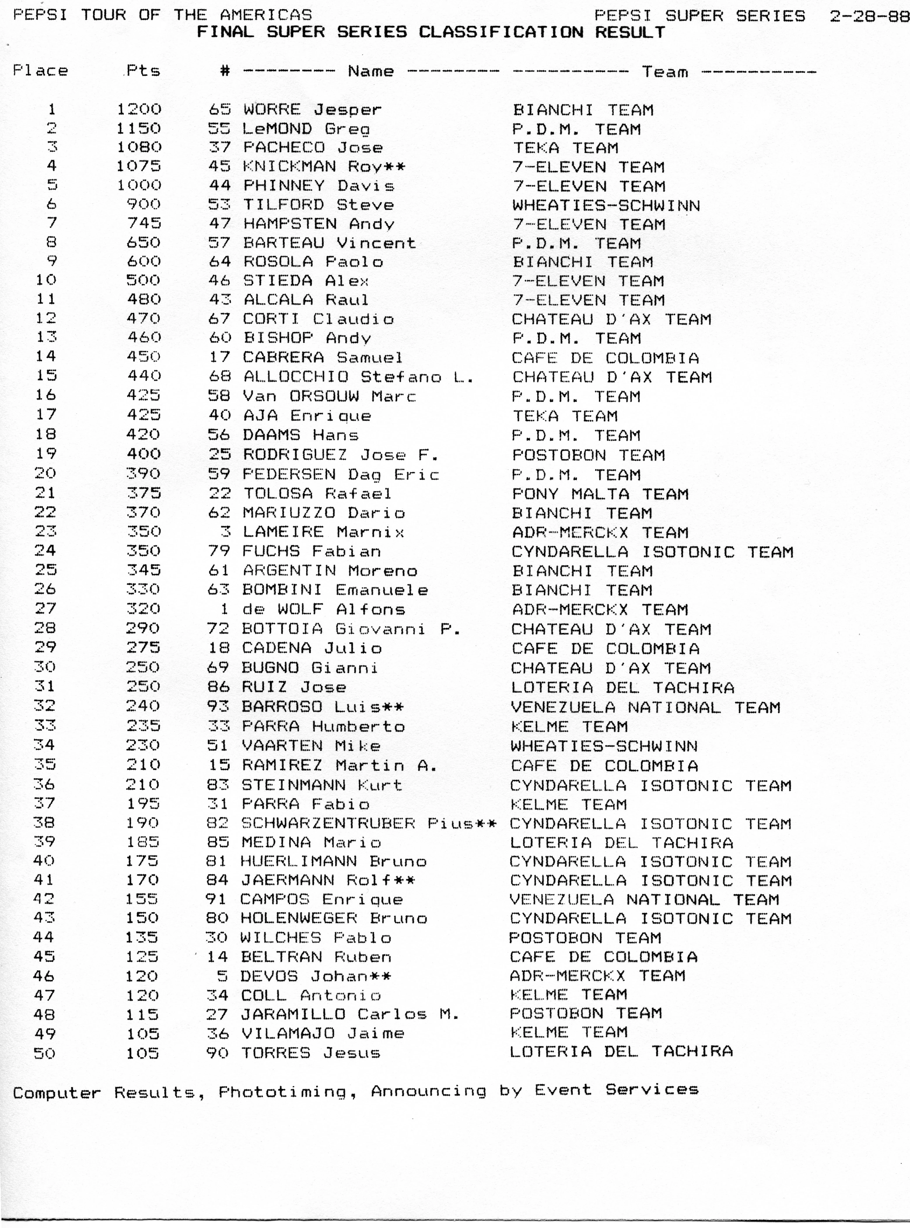 And the final results with LeMond 50 points behind Worre.