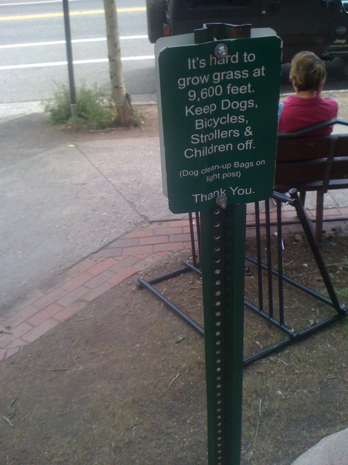 Here’s a sign in Breckenridge saying to stay off the grass. Notice the bike rack on the grass behind.