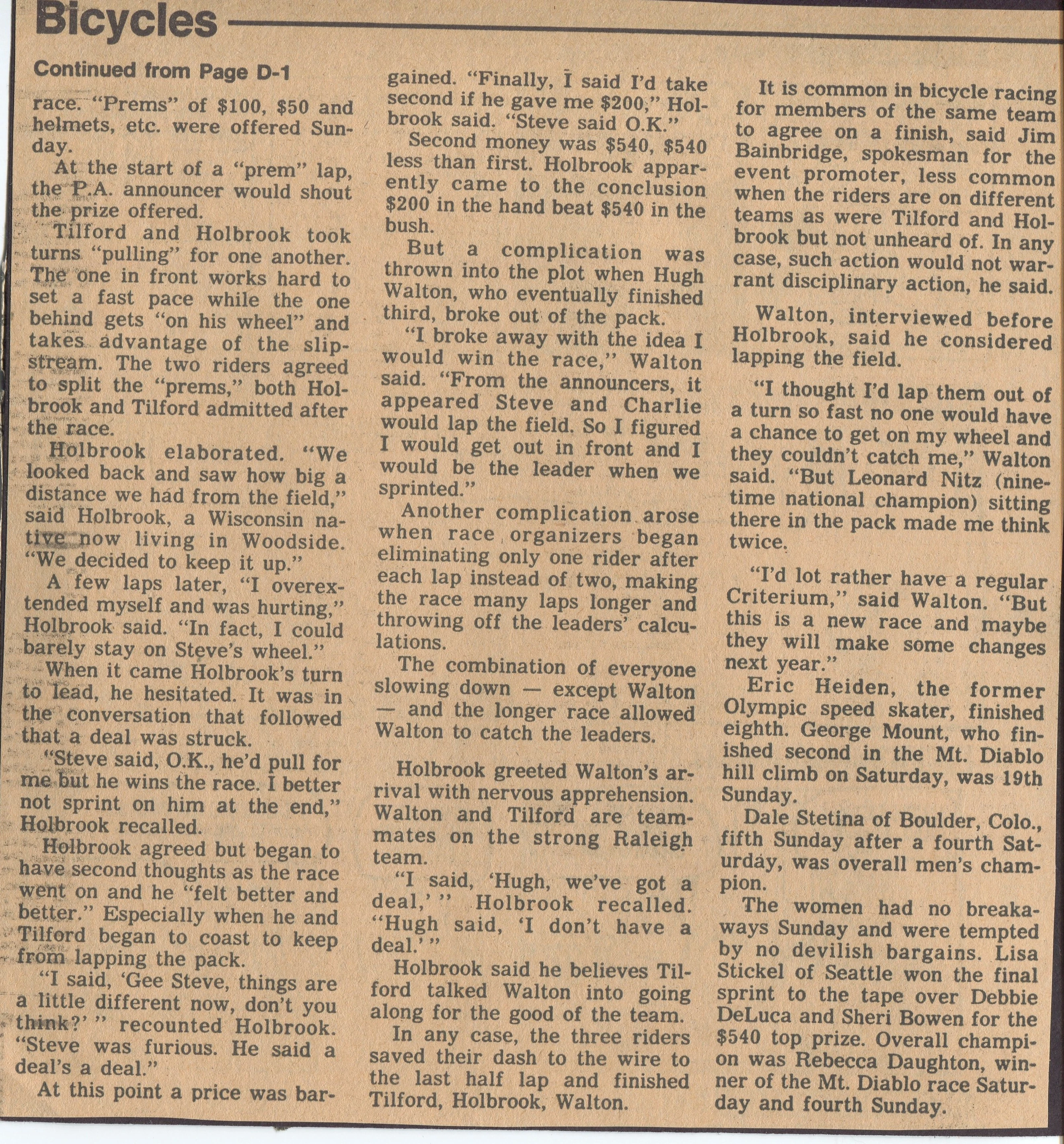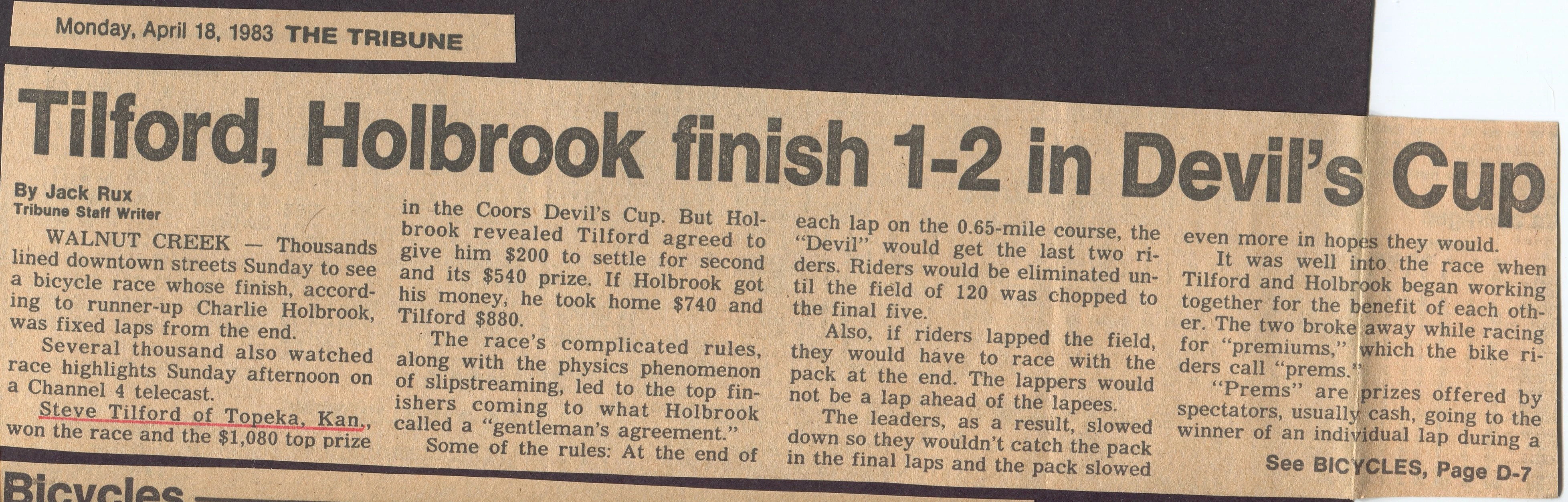 Below is an article from the 80’s about me having a similar problem in an important criterium, The Coors Devils Cup, outside of San Fransico, in Walnut Creek. The problem was that our team was trying to secure a Levis sponsorship, so having this article on the front page of the Chronicle’s Sports page was about as bad as it could have been, since Levis’ headquarters is in San Francisco.