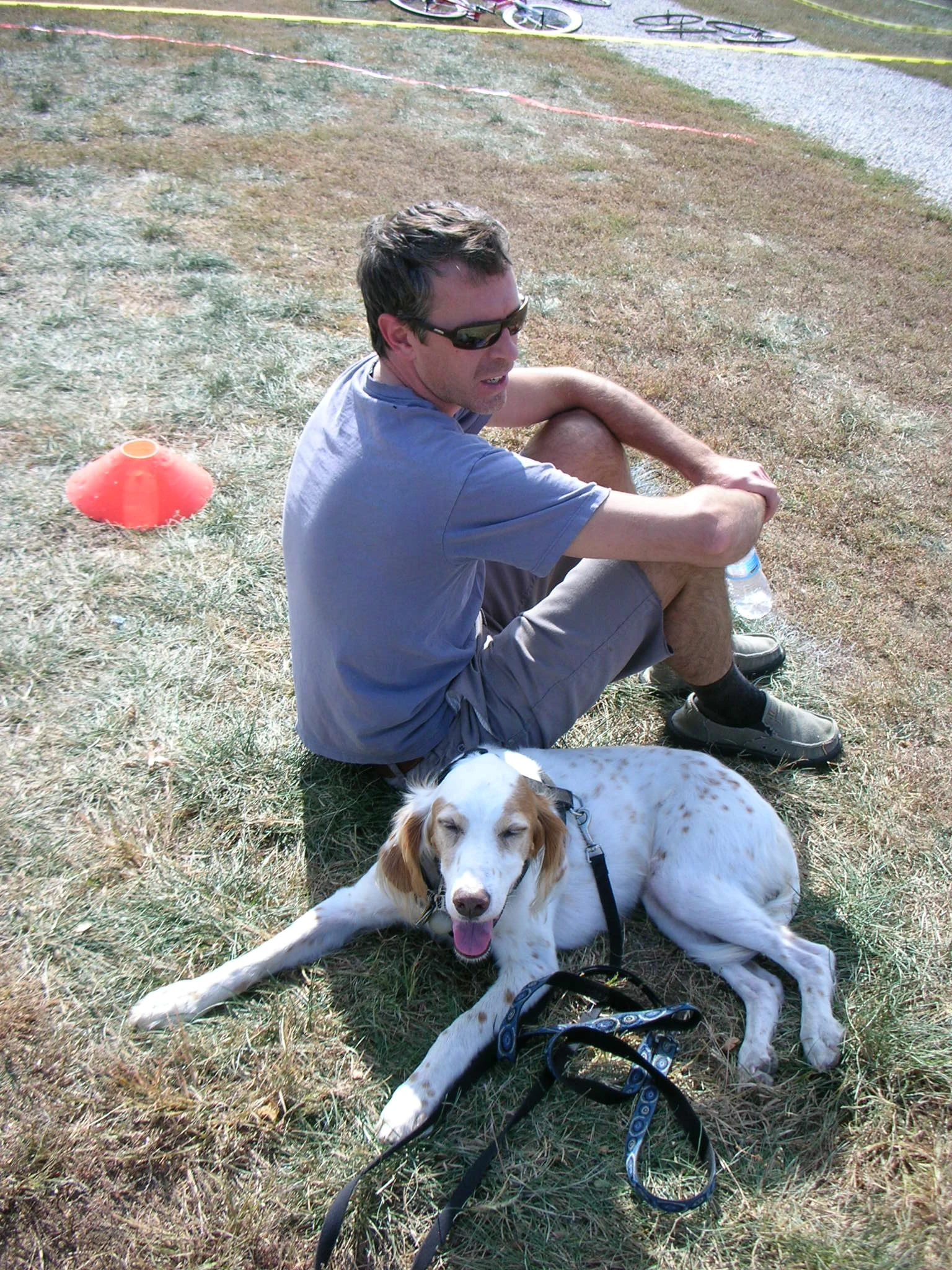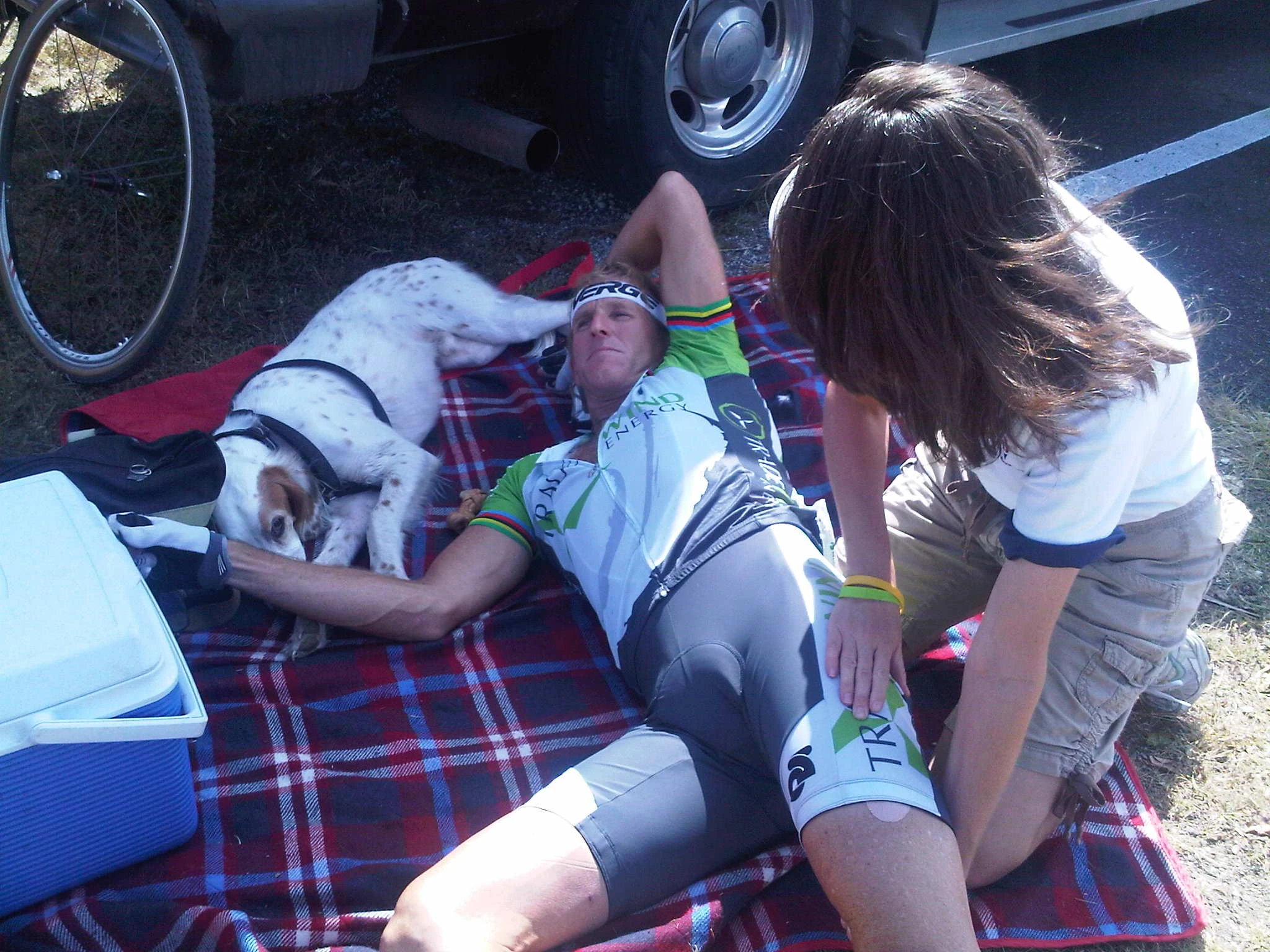 Bromont trying to stay cool, using the shade of Matt Gilhousen, our TradeWind Energy sponsor. Matt had already raced.