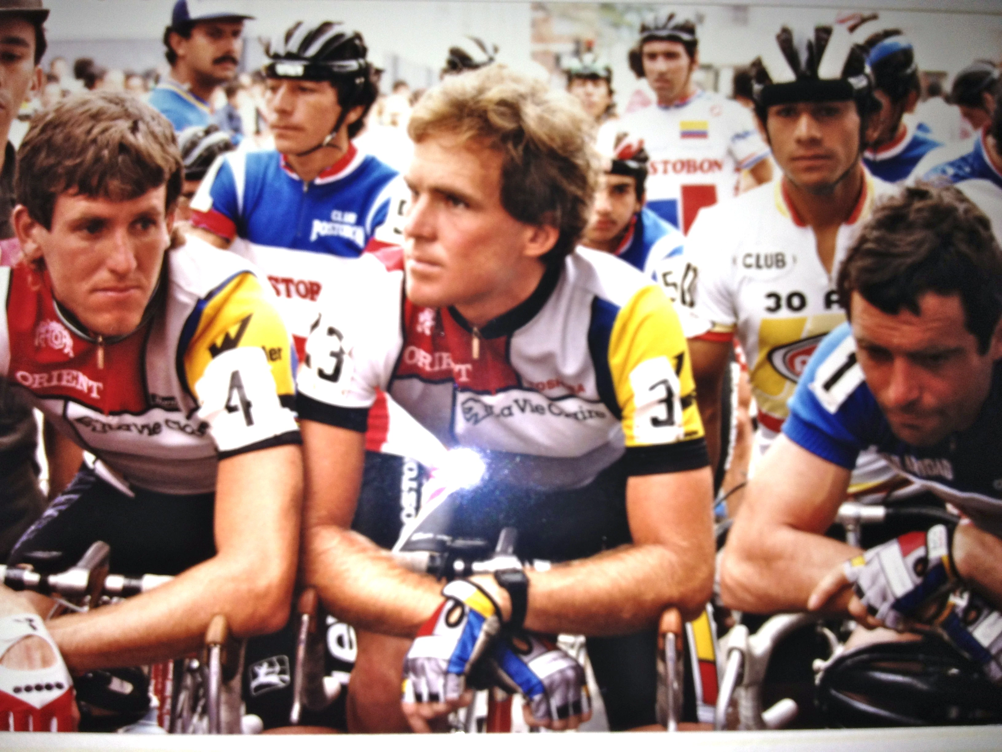 Later that year, at the Coor’s Classic, I was eating breakfast and noticed someone crawling around on the top of our team van. I went outside and asked the guy what he was doing. It was the president of Yakima, Don Banducci, putting a wind deflector on the front of our rack. Yakima printed a poster a couple years later with a picture of the field in the Coor’s Classic and I was at the front, but over on the left side of the road by myself, looking back and it said, “Yakima, look for us at the back of the pack.” Or something like it. It’s one of my favorite posters, probably because of the scenery and the whole race stretched out in the distance.