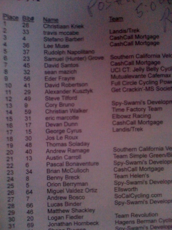 Looks like Christiaan Kreik is headed onto bigger and better things. Funny, there’s no team info. http://www.cyclenation.co.za/news/road-news/news/item/9118-first-us-victory-for-christiaan-kriek That’s a tough race! Good job Steve.
