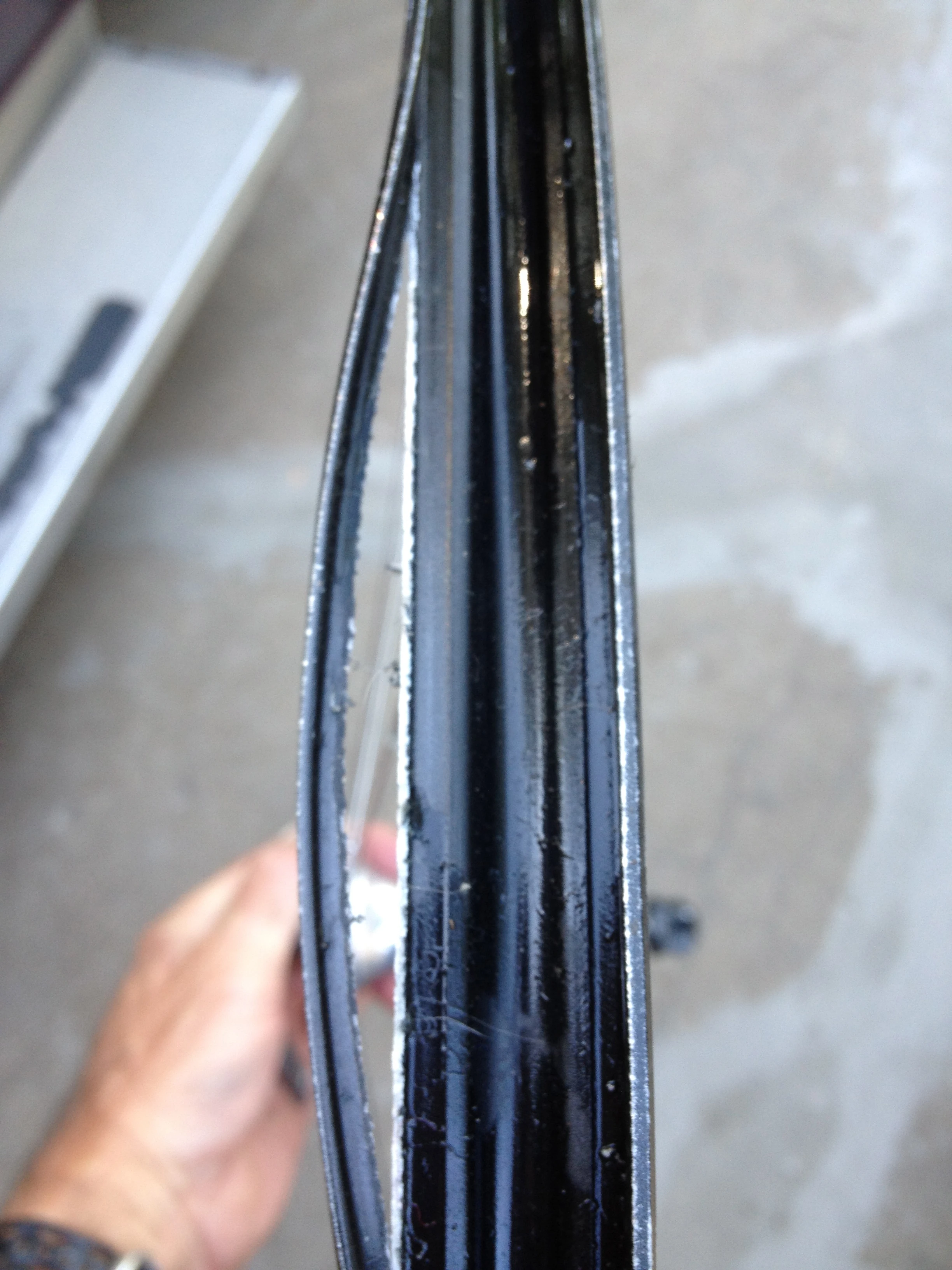 Before riding yesterday, I was mounting up fat, tubeless tires on my wheels. I’ve had an original set of tubeless Shimano wheels for over 10 years. I’m not sure when they first released them, but I got them a little before that. Anyway, I gave the rear wheel back to Shimano this spring because it was cracked on the rim. I figured I’d ridden it between 100,000-150,000 miles. The front seemed okay. But, no. I was inflating the tire to get the bead seated and all of a sudden, boom, latex everywhere. My ears are still ringing. The rim split and the tire blew off pretty much in my face.