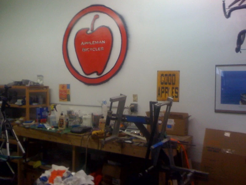 I got up this morning and went by this local frame builder’s shop, Matt Appleman. He builds in carbon. Other than Nick Crumpton down in Austin, I’m not sure I know of another custom builder of carbon. I don’t, but I’m sure there are lots around. Anyway, it was pretty interesting.