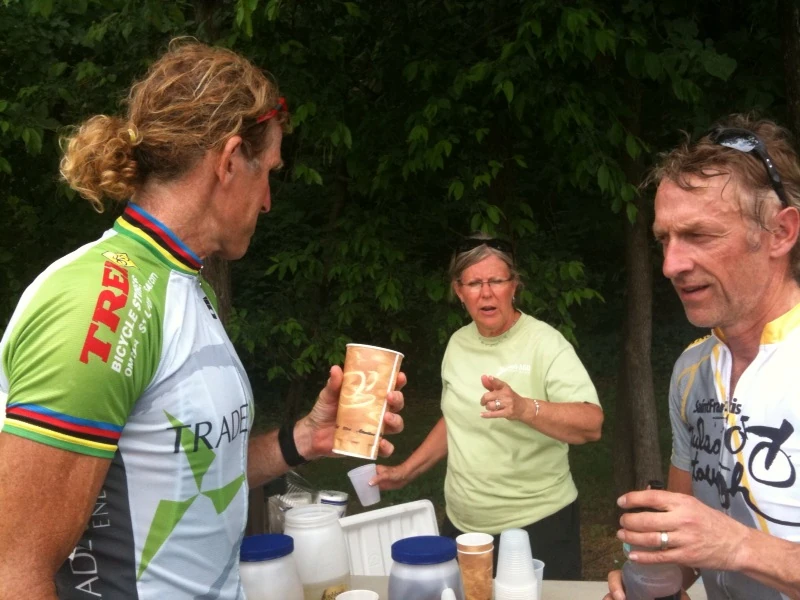 Brian was super strong. He’d raced 3 criteriums in St. Louis last weekend, but a course like this suited him much better. It is like a long version of Sunday’s race in Tulsa Tough. A lot of guys got shelled the first couple times up the steep pitch. Finally on the third lap, I jumped on the downhill and Janne Hamalainen, once again, came with me. There was only one guy left with Brian at that point. Brian sat on the guy for a mile or so while we started climbing the long climb. It was amazing how fast Brian came up to us. He actually skidded, slowing down to wait for us, on the climb because he was coming by so quickly.
