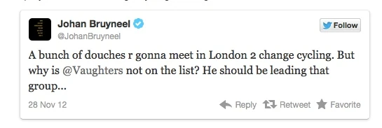 Heard about the summit they are holding this weekend in London, The Change Cycling Now Group? I’d like to go there and listen to what these guys have to say. I’m thinking it is going to be a very hard task. And here’s the one of the reasons why-