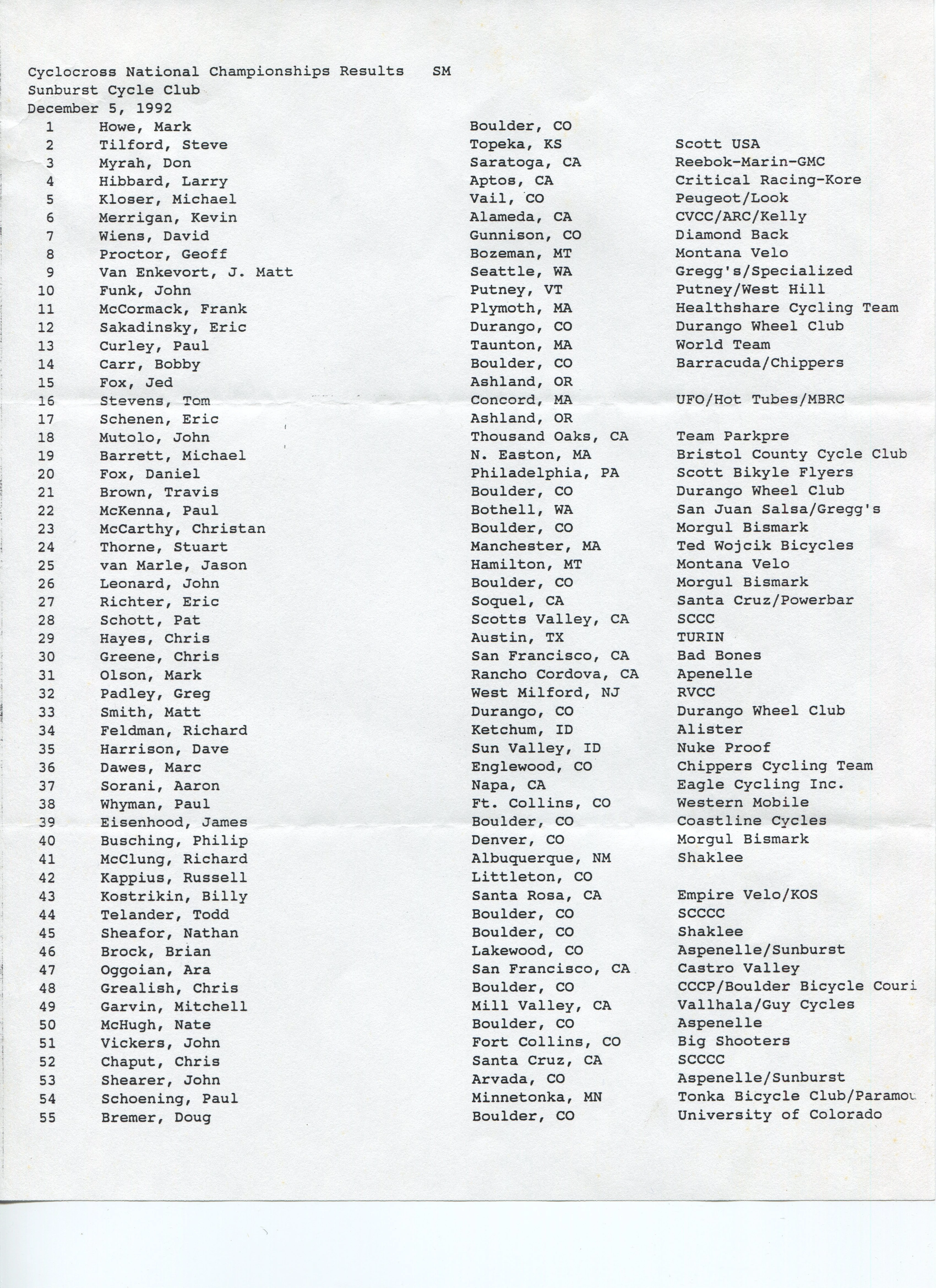 ‘92 was just as I started payiing attention to ‘Cross..Didn’t race Nationals ’til ‘94 and have raced Nats every year since. It’s so cool to see these results again. Thanks for posting them(you must have quite the filing/archive system). Check some of names that pop up that are still at and not. ..of course Paul C.. Stu Thorne-who was still racing when I started ‘cross and I actually first met in Fl and not New England. Geoff Proctor in 8th good ole’ tom Stevens in 16th. Jed Fox..what ever happened to him?…he was one of our early deciples to gave Europe a fair shot. BTW he is no relation to Danny Fox from Philly who you should remember from the old Jeff Rutter days. some current Master die-hards-Feldman and McClug Eric Richter from Giro in the top 30 Trying not to clog up your blog here..thanks for posting..maybe get some others chiming in..