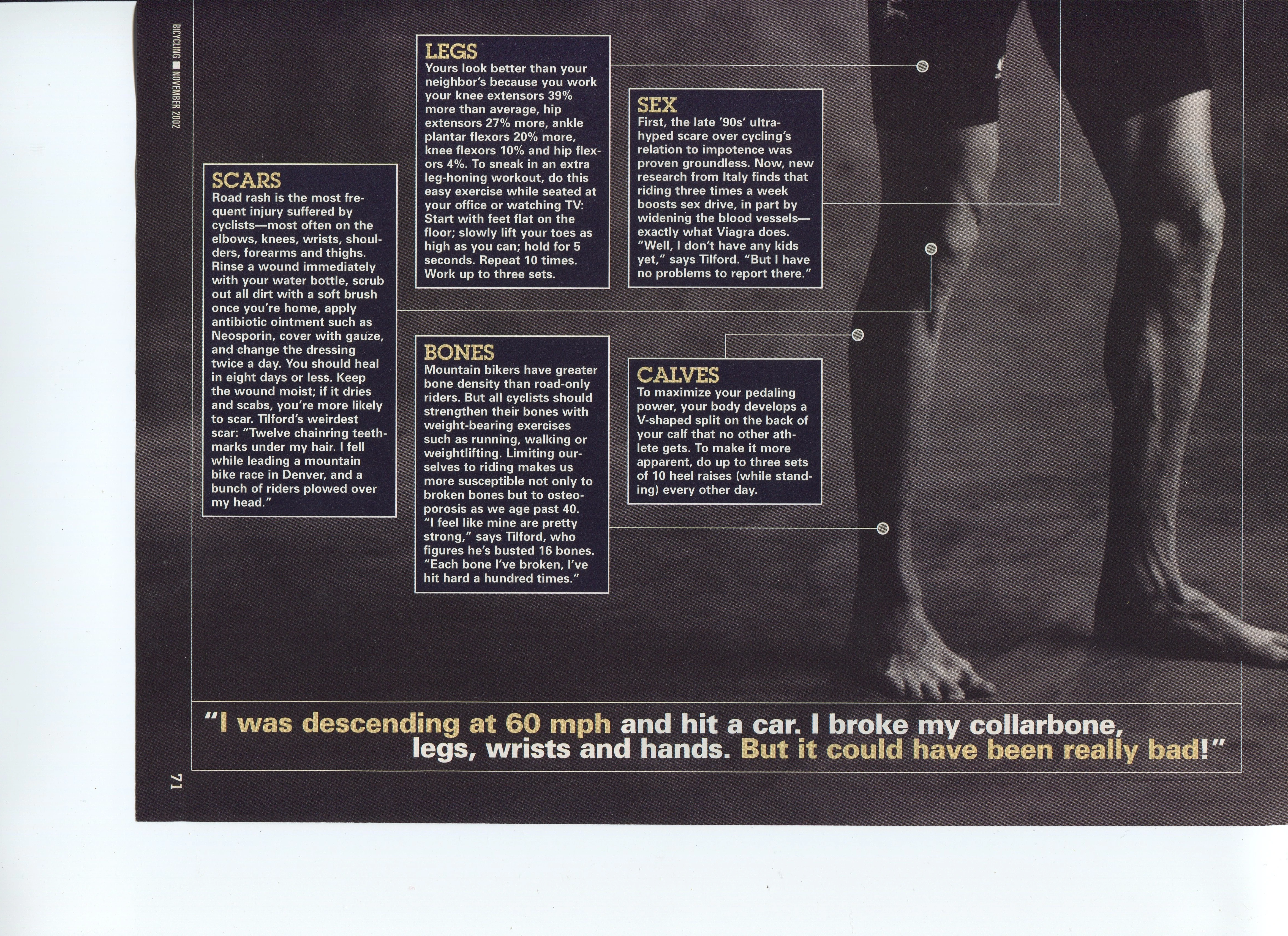 I’ve been hurt a bunch racing bikes. Bicycling Magazine did an article on me a few years back with a semi-nude shot and pointing some of the injures I’ve incurred throughout my lifetime racing bikes, along with the attributes of being an athlete. It is kind of weird because I haven’t really been hurt too bad recently. It seems like all the little nicks are turning into lifetime injuries, but that is just age. I haven’t had a broken bone or really bad crash for a few years.