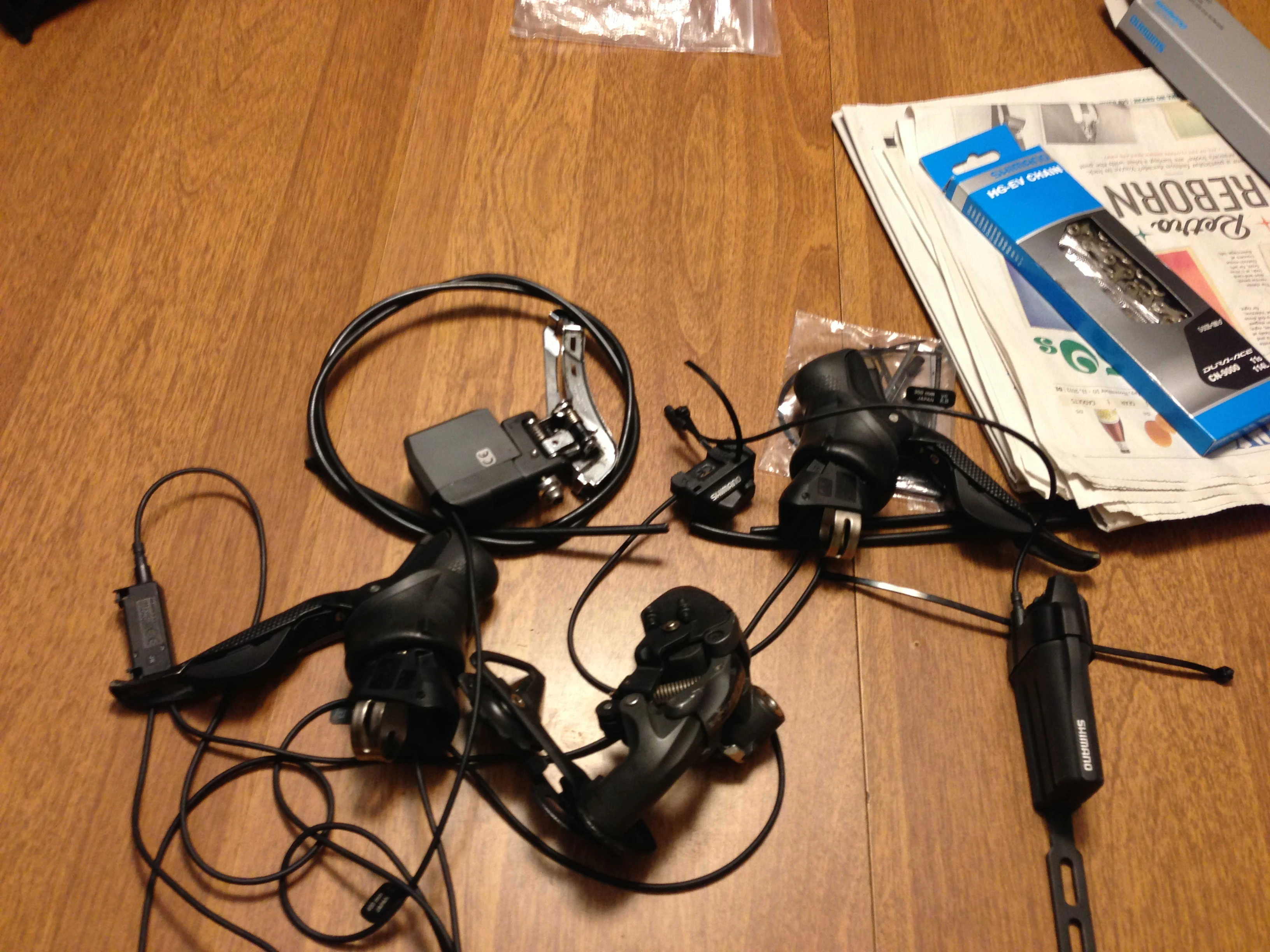 I was playing on the kitchen table with my new Di2 shifters for my cross bike. I still haven’t put them on yet. It is kind of fun wiring them up and watching them move on their own. The front derailleur adjusts automatically for the trim of the rear derailleur, so when you’re shifting the rear, the front aligns it self.