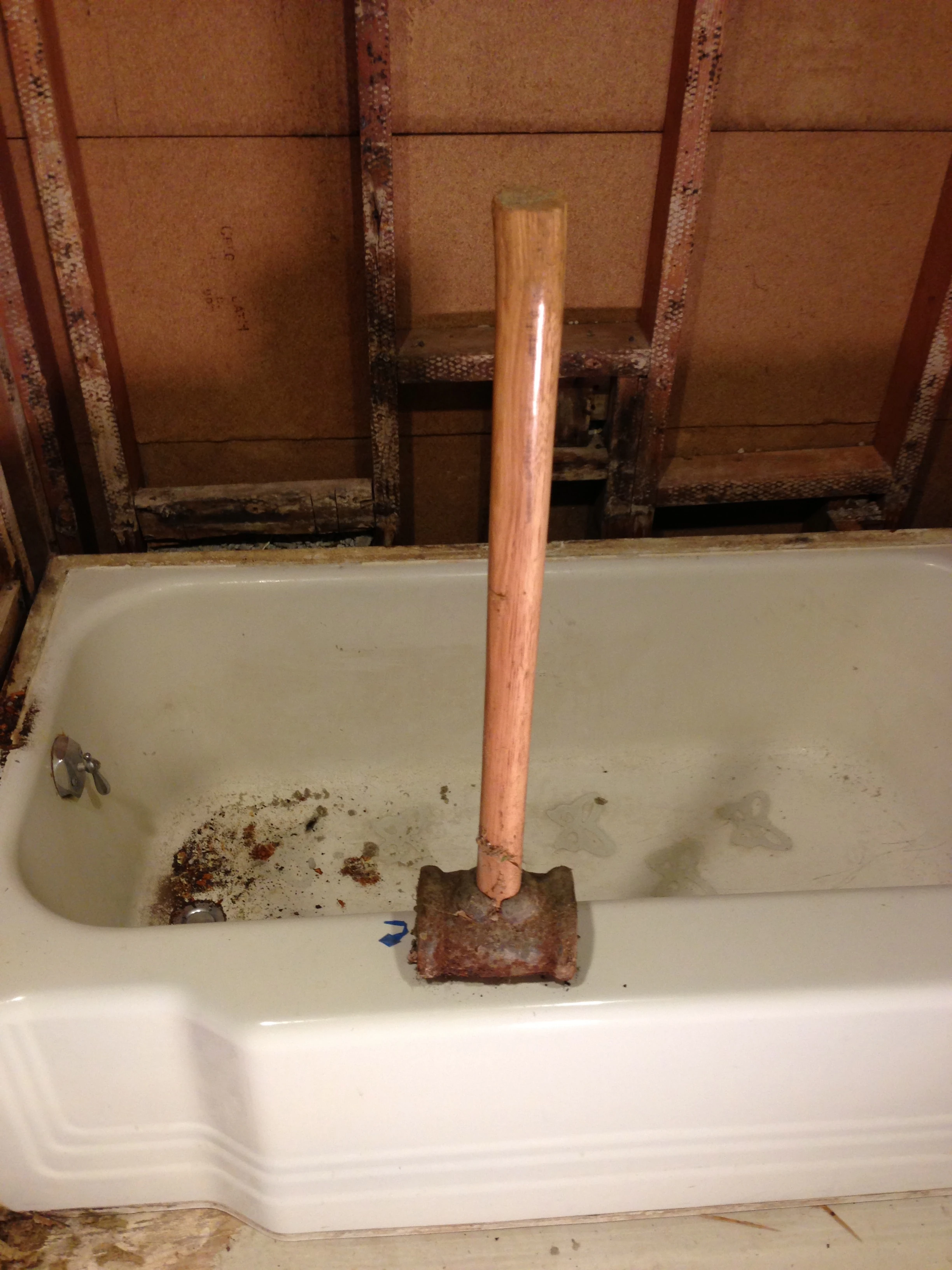 Adam smashing his tub to remove. The thing weighed about 350 pounds, so we broke it up a little more.