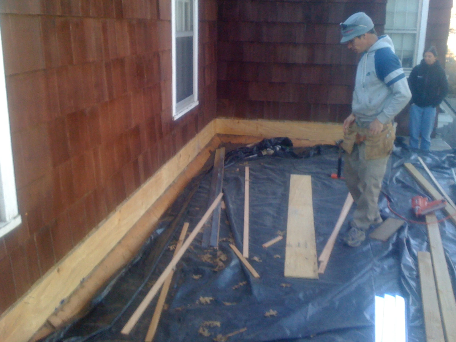 I spent most of the morning on my knees cutting wood and measuring. By the afternoon, when it came to the real work I was already sore. That being said, it is a good physical workout. More equivalent to weight lifting than anything else. Plus, since it’s winter, the temperature and body temperature regulation is kind of tricky. I got all dressed for standing around at 40 and pretty soon I was down to a T-shirt sweating. Then, later in the afternoon, when the sun had moved further west, we were in the shadows and it was cold again.
