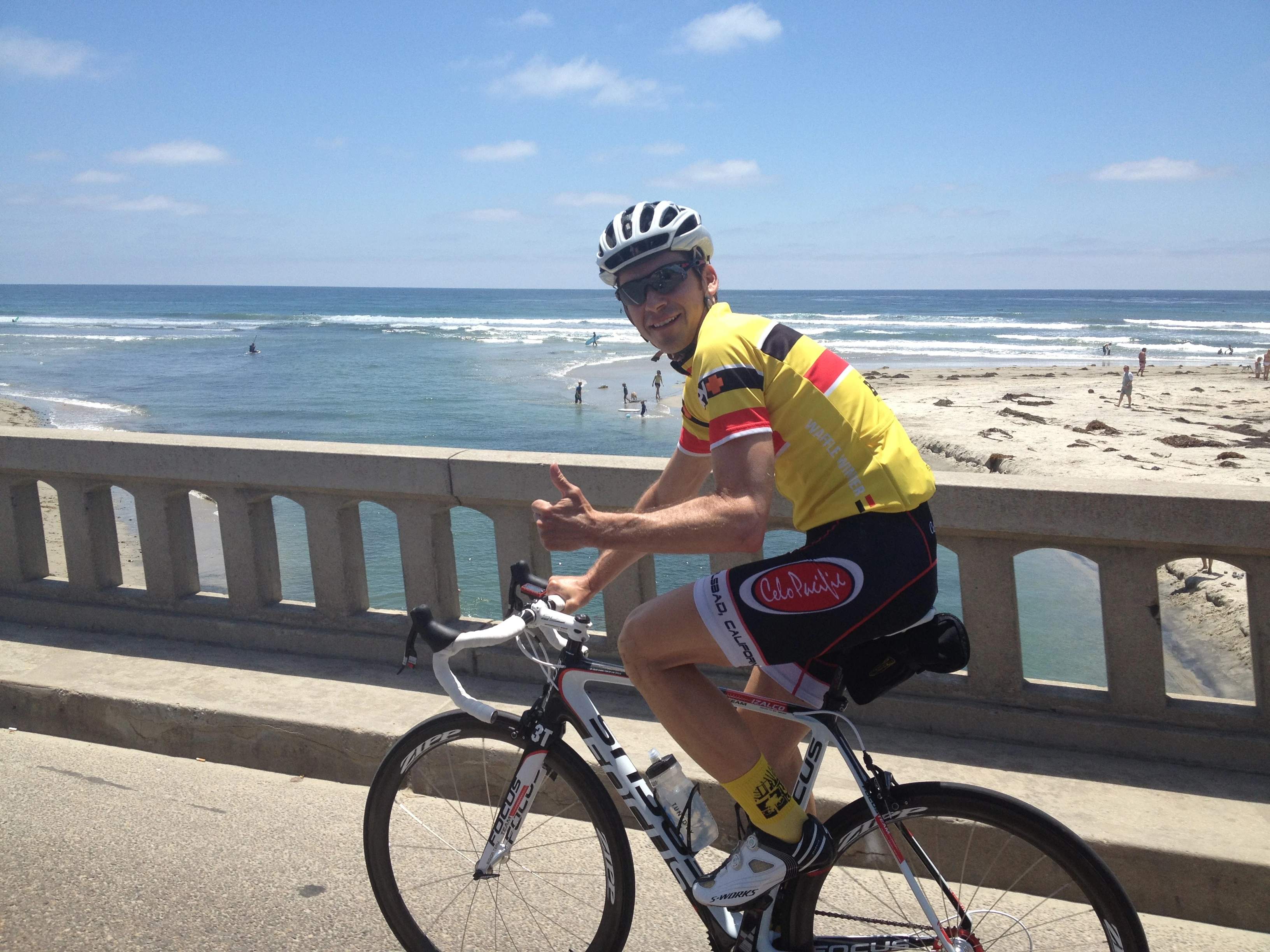 I was riding South along the coast highway and my friend, Brent Prenzlow, was riding North, pulled a u-turn and rode with me for awhile. He is wearing the winner’s jersey from the Waffle Ride/Race, from back in April.