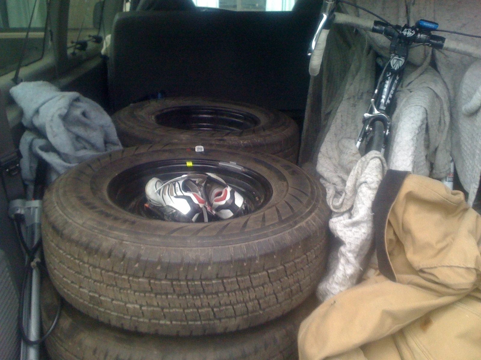 New wheels and tires in the back of the van. I didn’t have the energy to put them on manually, without pneumatic tools.