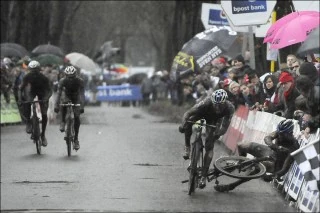 You should click here to see the sprint today in a very muddy cyclocross. Here is a link to a write up on the race too. I have a very hard time they only relegated Stybar to 4th. Guess that is cyclocross officiating in Belgium. Jan Denuwelaere was lucky he slid across the line to win.