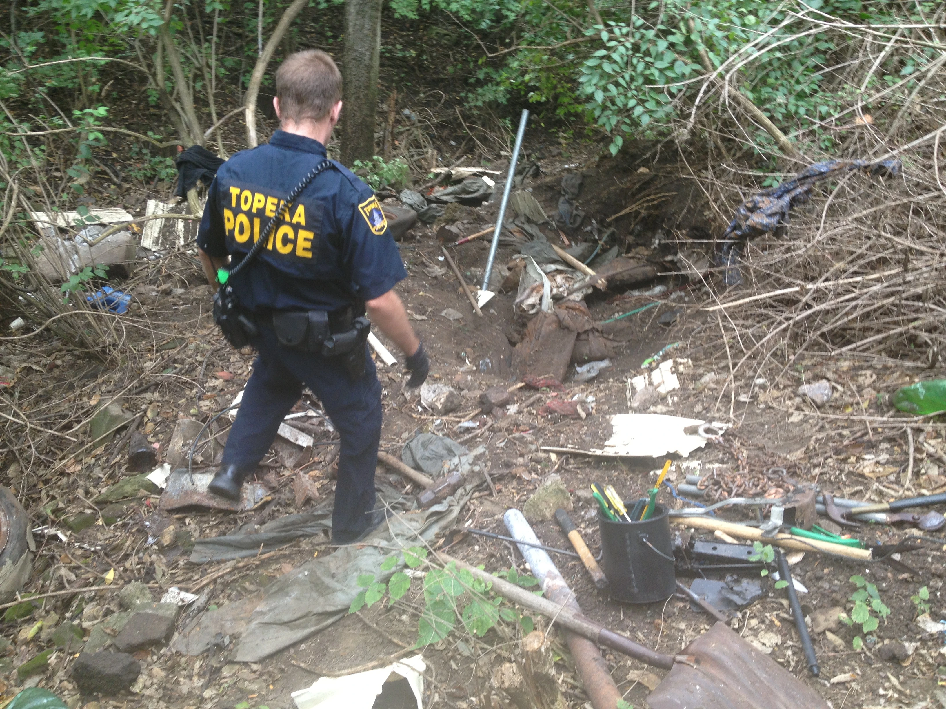 Anyway, I was under the car, when a guy pulls up in a Rescue Mission car. He gets out and goes to the door. I crawl out from under the car, all covered in grease, and yell over to him. He walks over and tells me his story. Which was, he has been going over to that vacant land in central Topeka I own, looking for any homeless people that might be hanging there. I’ve never seen any signs of anyone living there. I only seem to be the recipient of people’s extra stuff, instead of the dump. He said that the cable is still across the entrance, but there is a car parked back in the middle. He asked me if I knew who was there. I told him no. He called the police.