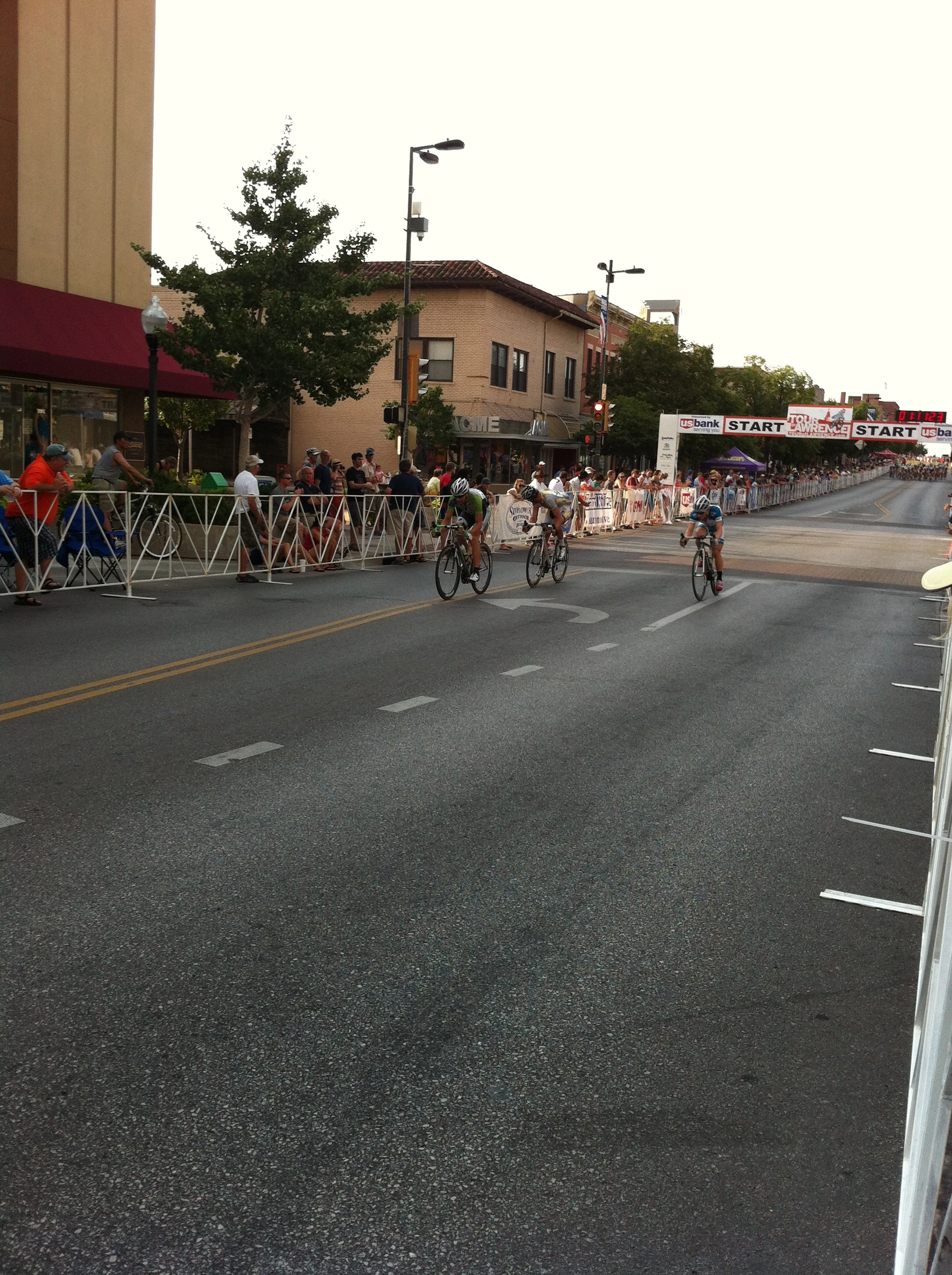 It was so close for the last 3 laps. The break was just hanging less than 10 seconds off the front. It was kind of strange trying to stay at the front of the field, hoping to slow it down, when setting up for a field sprint. With about 3 laps to go, there was a huge crash on the backstretch. I think Sean Sullivan fell there and that most likely changed the end of the race a lot.