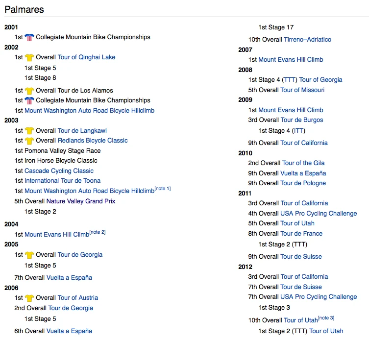 Below are some of his results courtesy of Wiki. I guess no one has gotten around to adding this year’s Pro Challenge results to it yet. As far as I’m concerned, they are are fantasy results. Might as well not have happened.