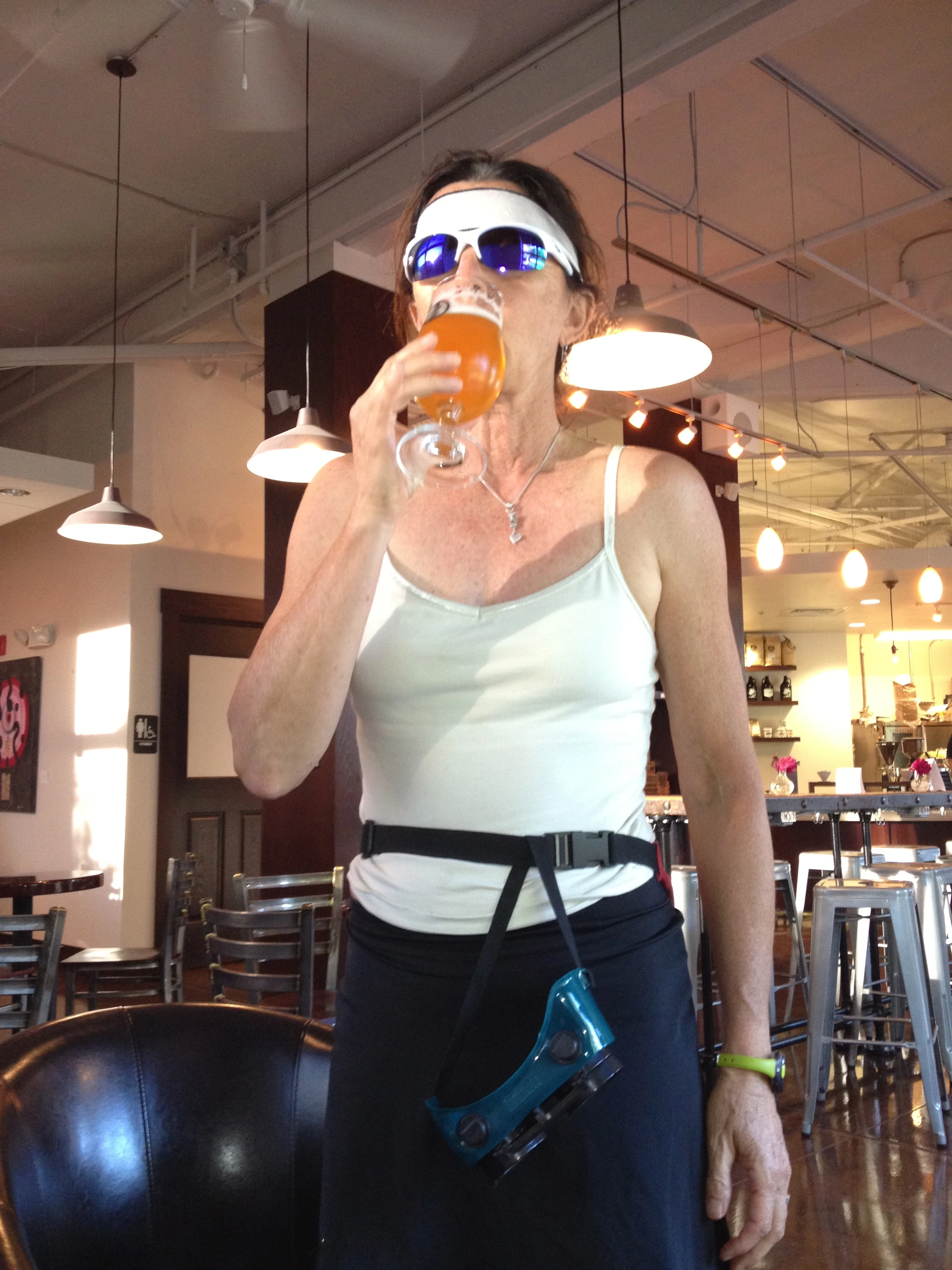 Trudi in a rush to make it back for viewing. Notice the welding goggles on her fanny pack strap.