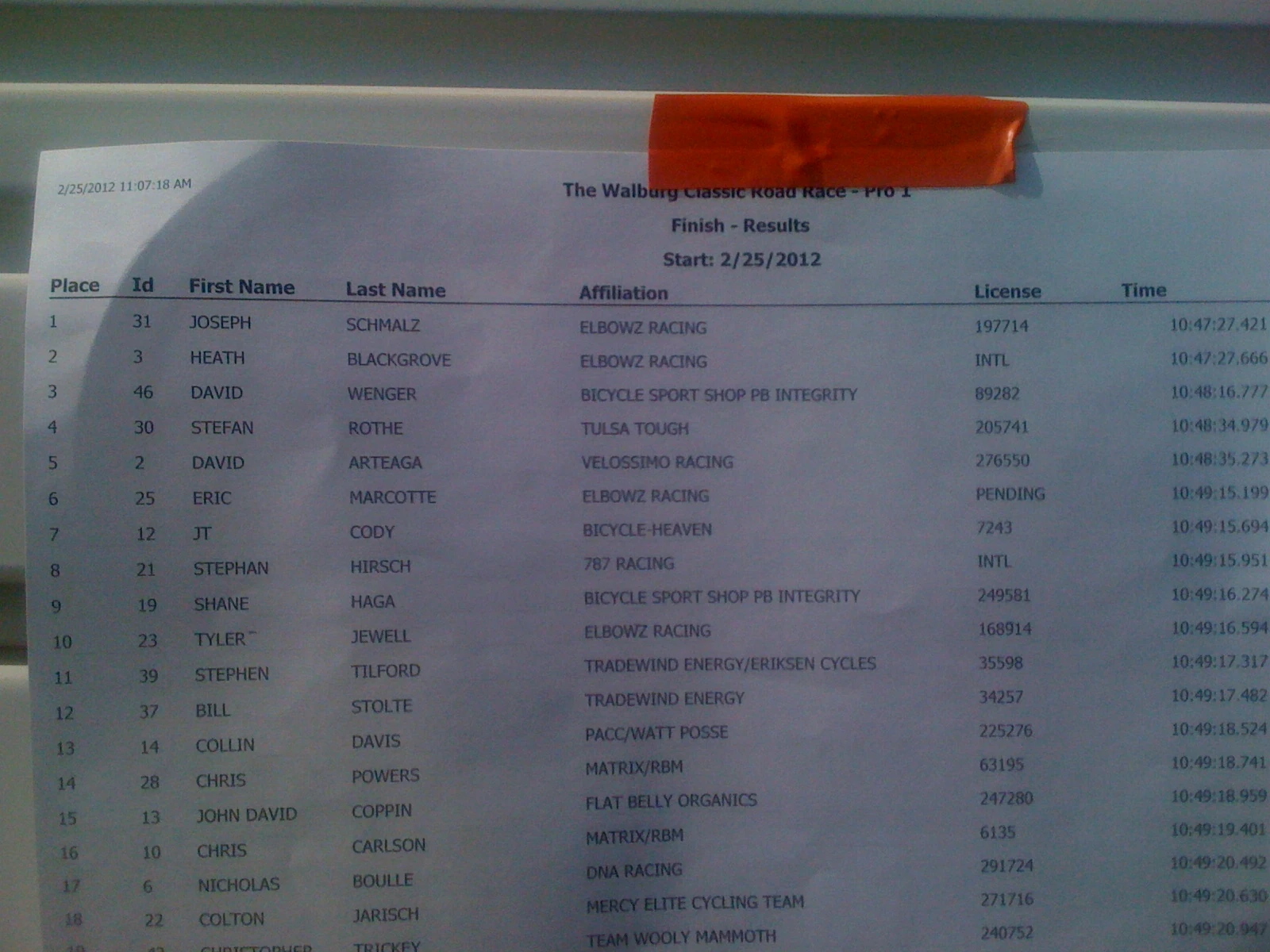 5 riders were away and the sprint was for 6th. Eric Marcotte, Elbowz, won the field sprint. I was 6th, messing it up big time. It was up a pretty good grade and the field pretty much explodes the last 500 meters. So, I finished 11th, Bill finished 12th, right on my wheel.