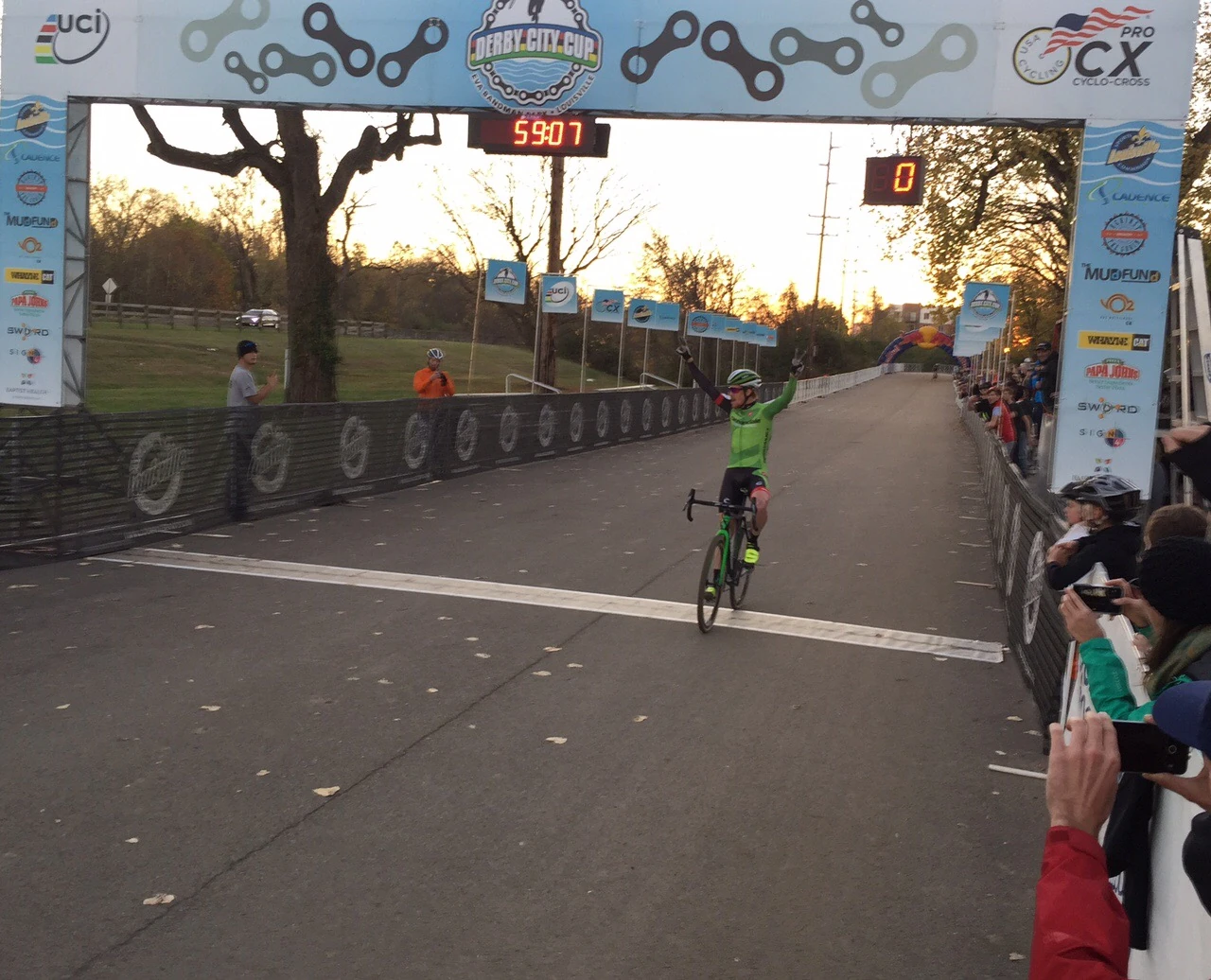 I’ll do the blow by blow when I get to a bigger keyboard. Short story was that I started at the back again. About 1/2 a lap in, I dismounted to run up some stairs and my leg foot got tangled/inserted into Jacob Lasley’s front wheel, who was behind me. I tripped and ended up falling backwards, my leg still connected to his bike. My leg was twisted pretty good and Jacob was super not yanking his bike. It took a bit to get separated. I just layed there and Jacob stayed. I eventually told him that we should probably start riding around in circles, so he took off. I got going a bit later. One of the weirdest crashes I’ve ever experienced.