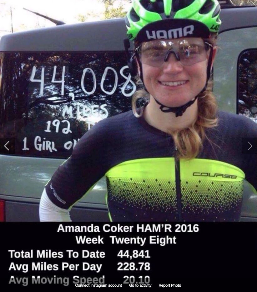 Down in Florida, Amanda Coker is riding her bike everyday. Like all day, everyday, for the past 246 days. She is riding a long ways, a long time and pretty unbelievably fast. Take yesterday for example.