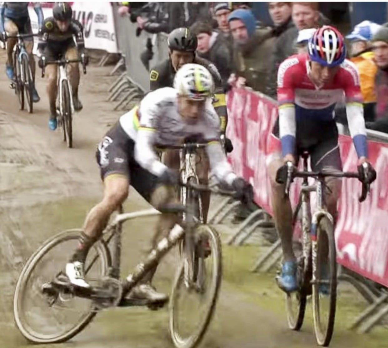 I just watched the Crash Compilation from Cyclocross Worlds. Not a single wheel does anything like that or anything like his did in the first event 4 weeks earlier. Of all the crash compilations I’ve watched from road racing, only Ryder’s rear wheel seems to have a mind of it’s own. This is so blatant that the UCI has to be covering this up not to sanction these riders.